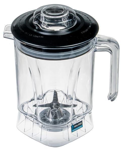 Стакан на фоне массивного корпуса выглядит небольшим и даже компактным, хотя это не совсем так. Его рабочий объем — 1,5 л. Форма сложная — параллелепипед со скругленными боковыми гранями кверху переходит в цилиндр. Диаметр вверху — 15,5 см, что позволит без усилий извлекать готовые густые и вязкие массы с помощью лопатки. Изготовлен кувшин из прочного тритана, толщина стенок примерно 3,5 мм. Оснащен ручкой и носиком для слива готового напитка.