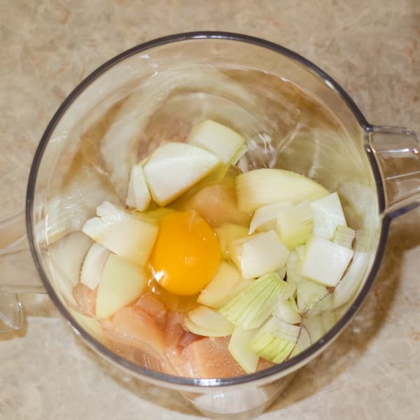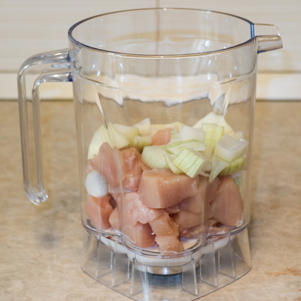К немелко порезанной грудке добавили немного молока, одно яйцо, половину крупной луковицы. Работали на второй скорости, затем перешли на третью. Всего измельчение продолжалось ровно минуту.