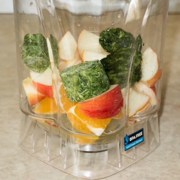 Блендер мощный, дело с такими приборами мы уже неоднократно имели, поэтому взбивать в нем молоко с бананом смысла нет — прибор способен к куда более сложным вещам. Именно поэтому первый же тест покажет нам, насколько хорошо аппарат измельчает волокнистые структуры — апельсин и шпинат, жесткие — неочищенное от кожуры яблоко и замороженные — тот же шпинат.