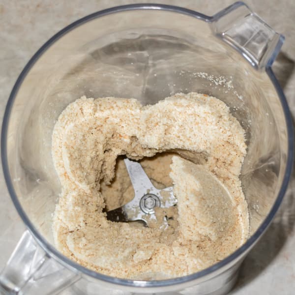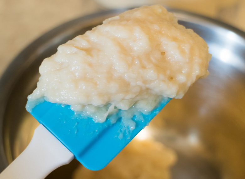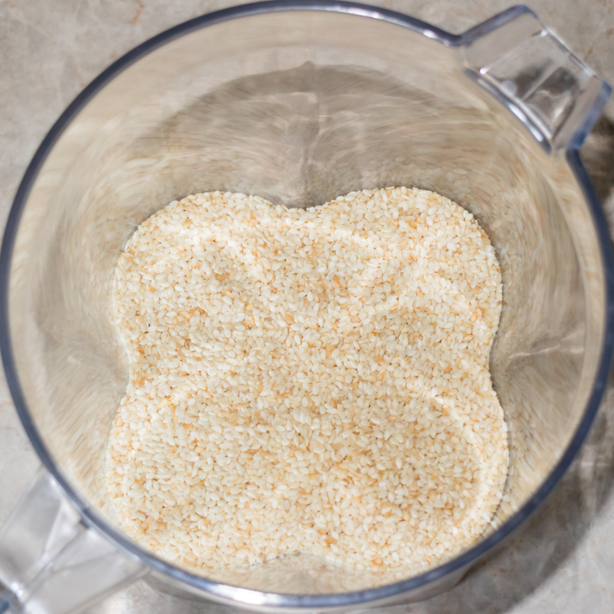 430 г белого слегка поджаренного кунжута измельчали в течение минуты. Кунжут превратился в мелкую жирную крошку. Счистили разлетевшийся по стенкам продукт в центр, добавили около 130 мл кунжутного масла и продолжили работу на второй скорости в течение еще полутора минут. Понижать скорость смысла не было; при повышении начинал образовываться воздушный пузырь. В процесс мы никак не вмешивались, лишь добавили немного соли и сахара.