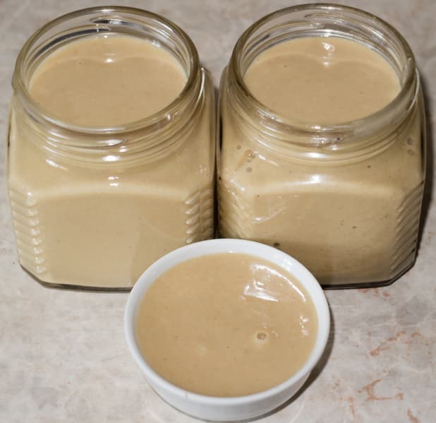 В результате получили равномерно перемолотый кунжут, консистенция не совсем однородная, но это совсем некритично в данном случае. Тхина не густая, хорошо перелилась в банки для хранения.