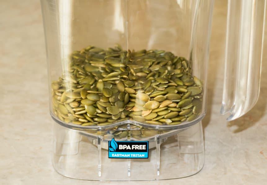 Блендер подходит для измельчения сухих продуктов, более того, в нем даже есть специальная автоматическая программа — Р3. Тыквенные семечки весом в 400 г предварительно немного поджарили. После того, как они остыли, высыпали в кувшин и начали экспериментировать.