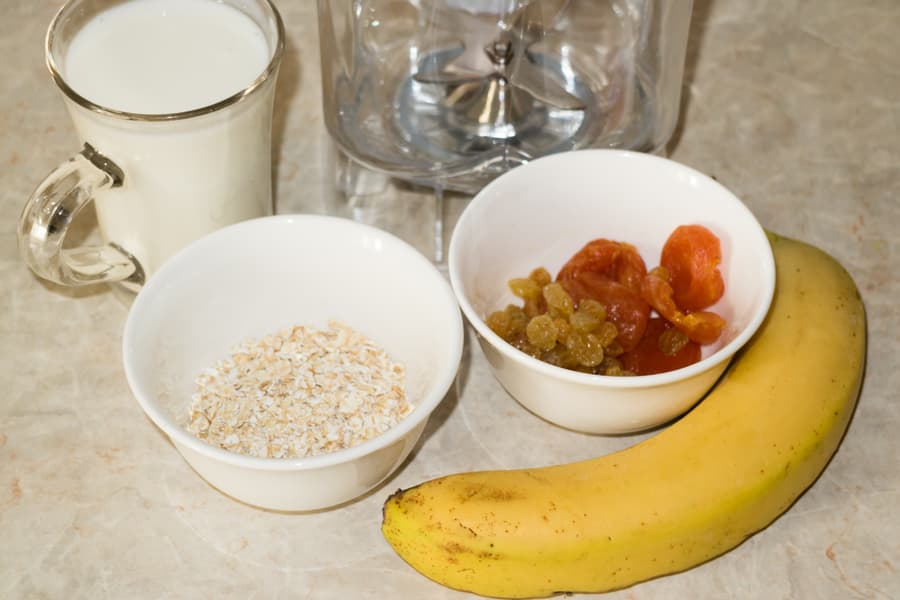 Этот смузи можно отнести к утренним — медленные углеводы из овсянки, полезные бактерии из натурального йогурта, питательный банан и сладкие сухофрукты — в сочетании эти продукты дадут хороший сбалансированный завтрак. Нам же интересно, как справится блендер с помолом вязких сухофруктов. Причем мы усложнили задачу — не размачивали предварительно, как того требует инструкция, и так мягкую курагу и не пересушенный изюм, а лишь помыли их.