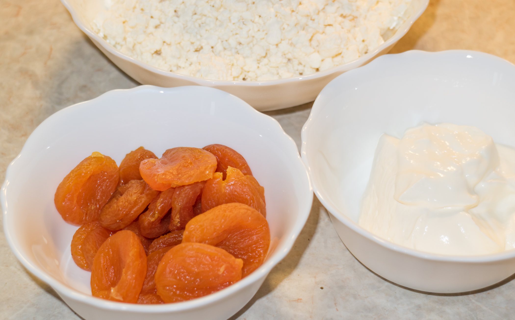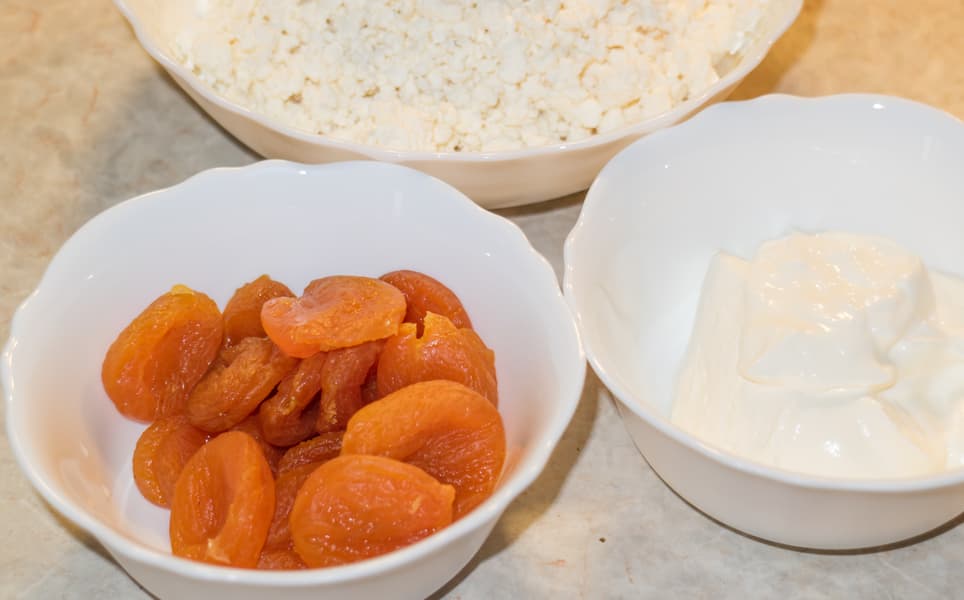 Попробуем еще усложнить задачу и сделать творожную пасту из обычного 9%-ного зернистого творога, добавив в него сметану и курагу.