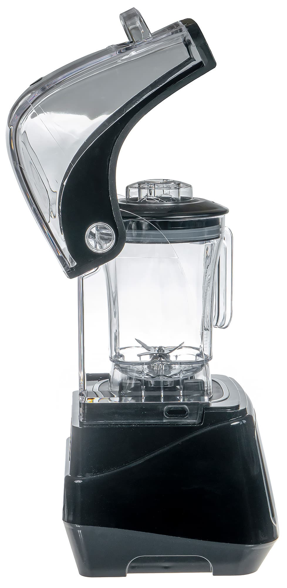 Ожидаемо, блендер отличается внушительными габаритами. В обычном кухонном шкафу он может не поместиться. Более того, при работе нужно будет подобрать ему место, не ограниченное сверху навесными шкафами, чтобы колпак мог свободно открываться. Второй момент связан с несъемной конструкцией колпака, что незначительно, но затрудняет его очистку. На наш взгляд, с этим неудобством можно смириться, поскольку достоинства прибора перевешивают, а очистку, возможно, нужно будет производить крайне редко — из накрытого крышкой кувшина брызги продукта не летят.