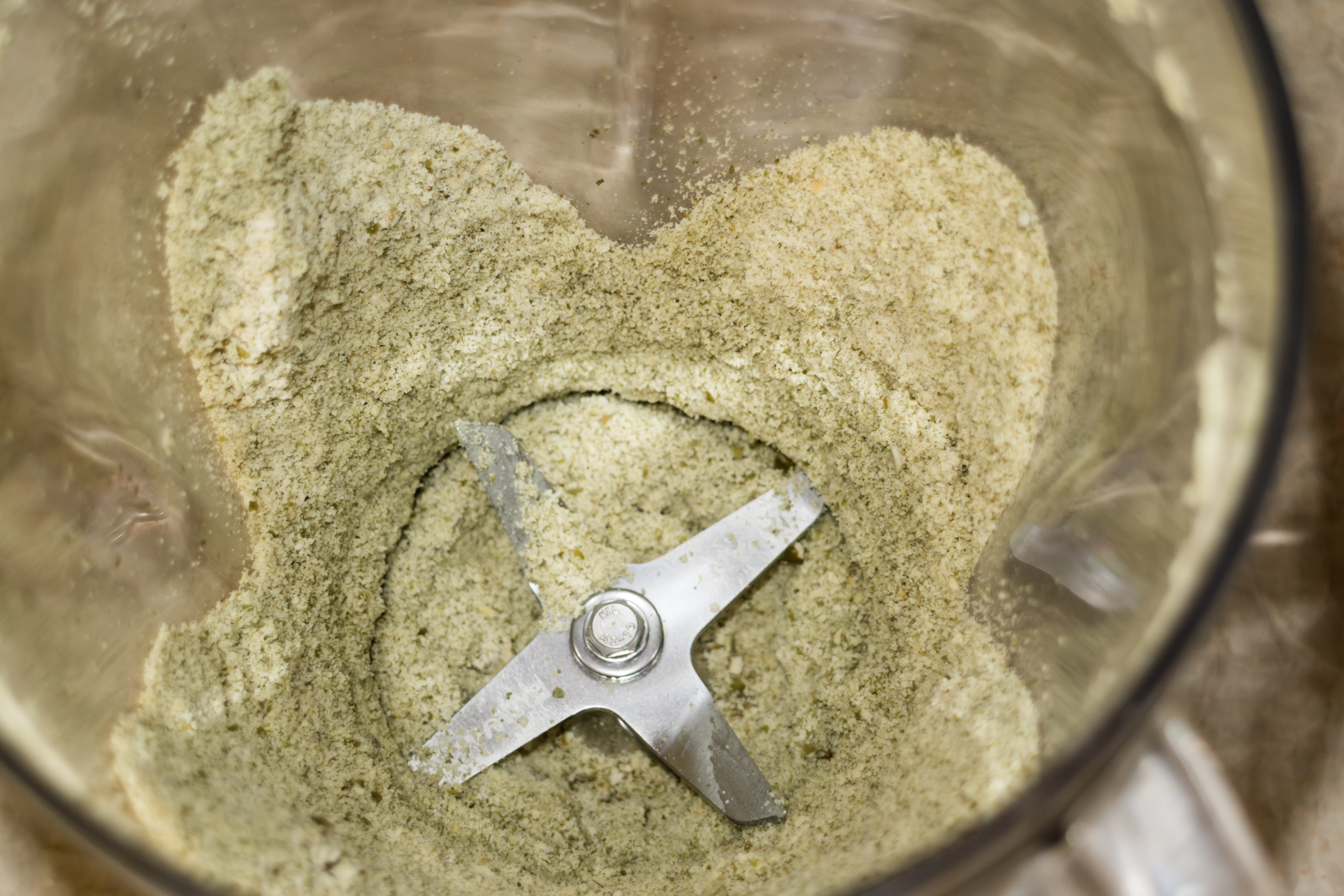 Долили немного масла и начали работать в ручном режиме. Запускали прибор на 30 секунд на средней скорости, затем счищали силиконовой лопаткой разлетевшиеся со стенок брызги к центру и опять запускали мотор.