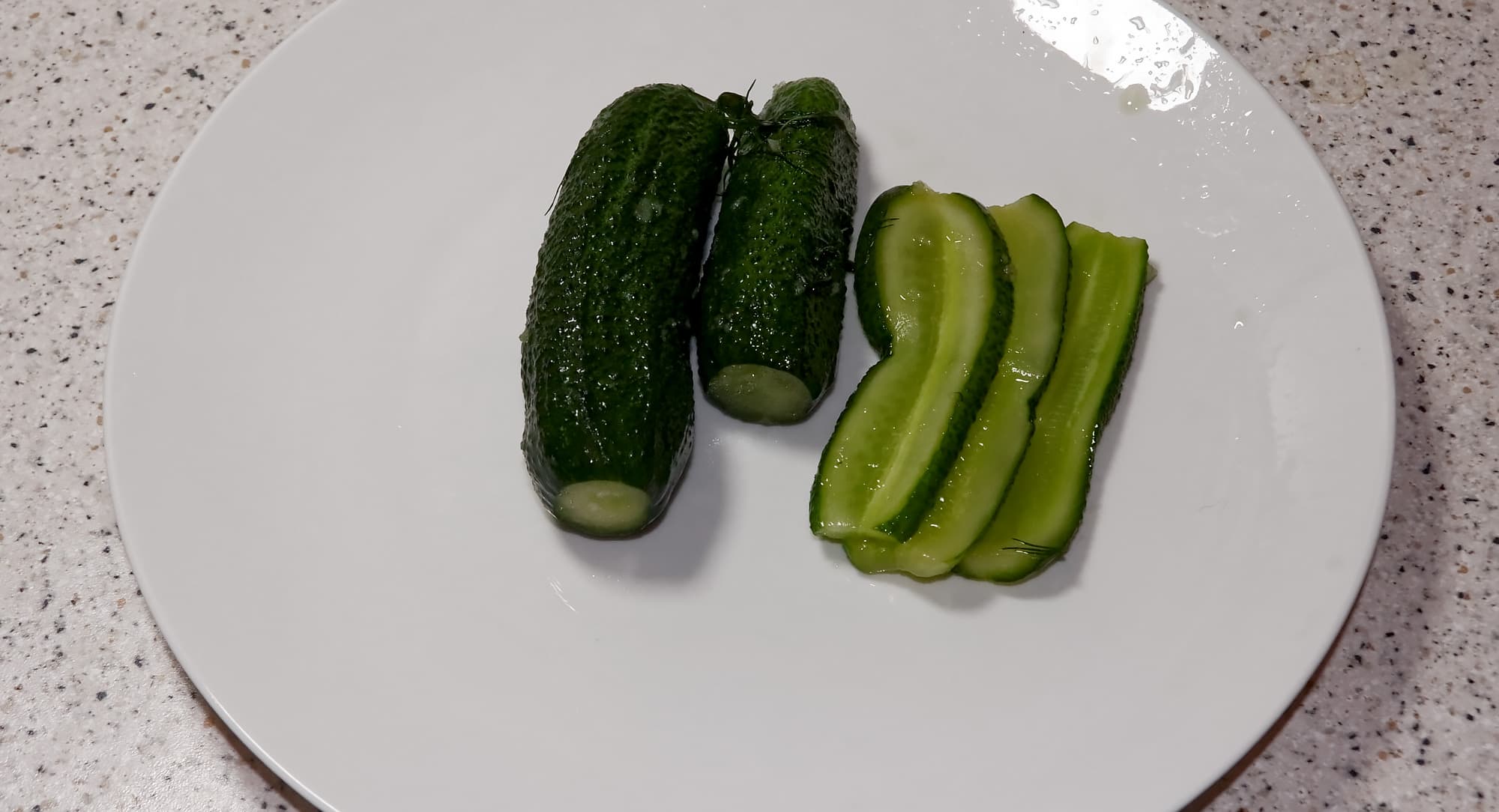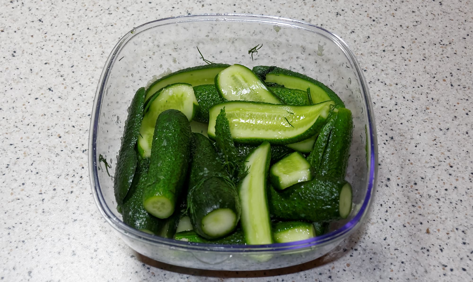 Нарезанные огурцы просолились до состояния «малосольных» уже через час. Целым потребовалось чуть больше времени — мы бы рекомендовали дать им просолиться часа три (по возможности, периодически встряхивая контейнер).