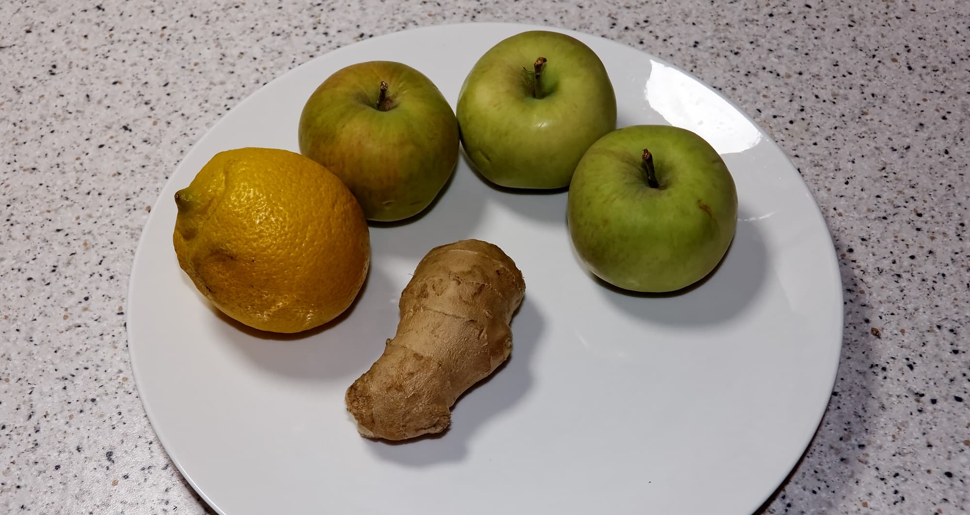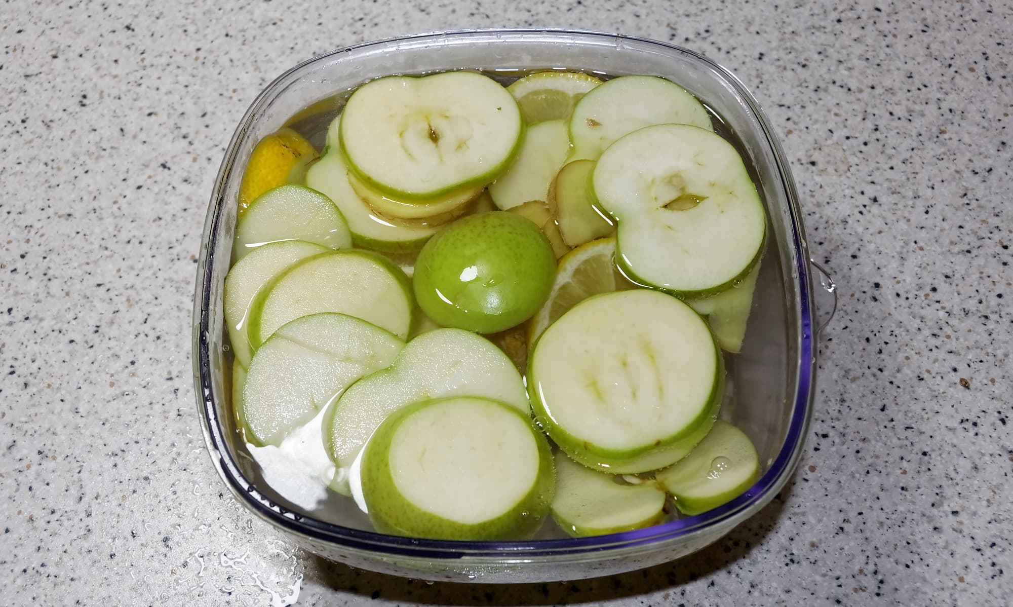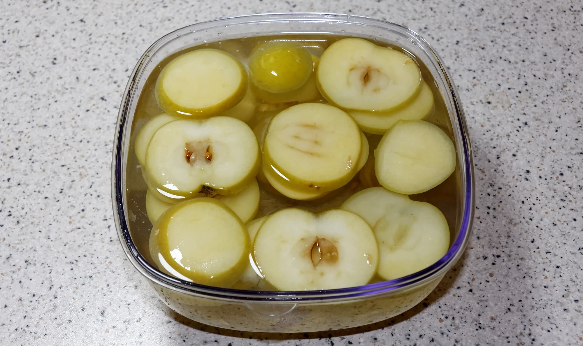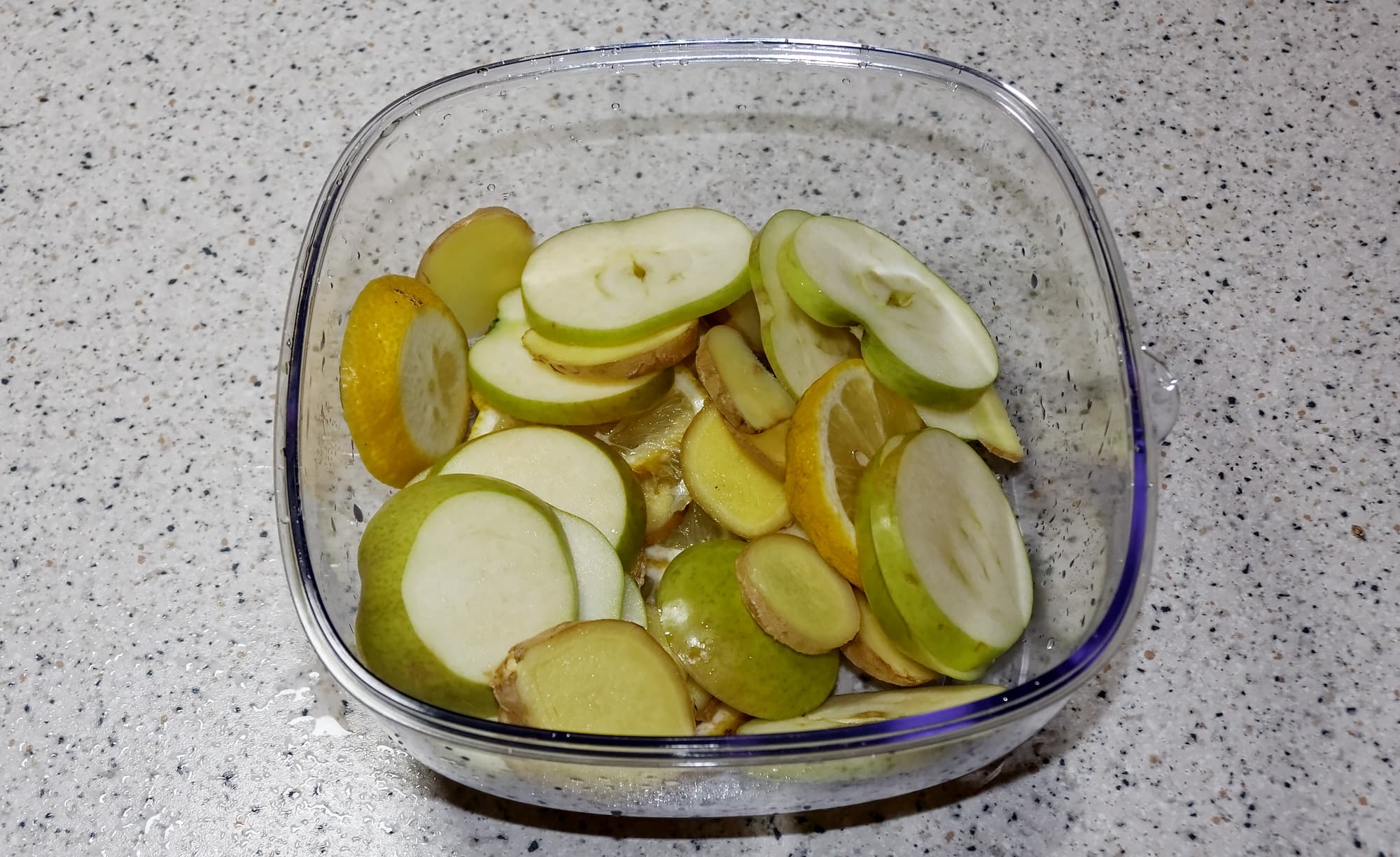 Мы нарезали яблоки, имбирь и лимон, заложили их в вакуумный контейнер, залили кипятком и откачали воздух.