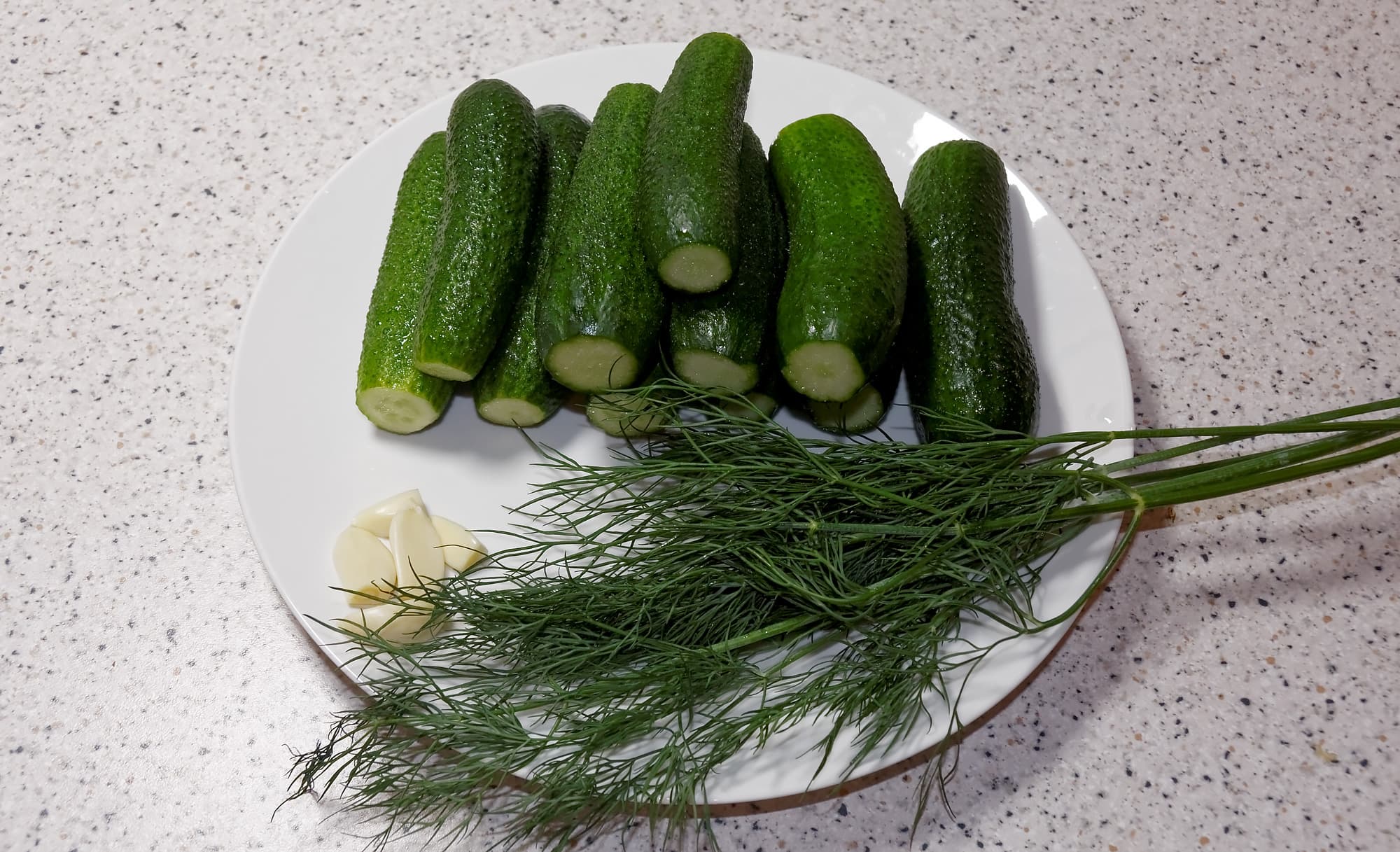 Мы взяли один килограмм огурцов, одну столовую ложку соли, 1 чайную ложку сахара, несколько зубчиков чеснока (их мы подавили) и пучок укропа. Часть огурцов нарезали вдоль, часть оставили целыми.