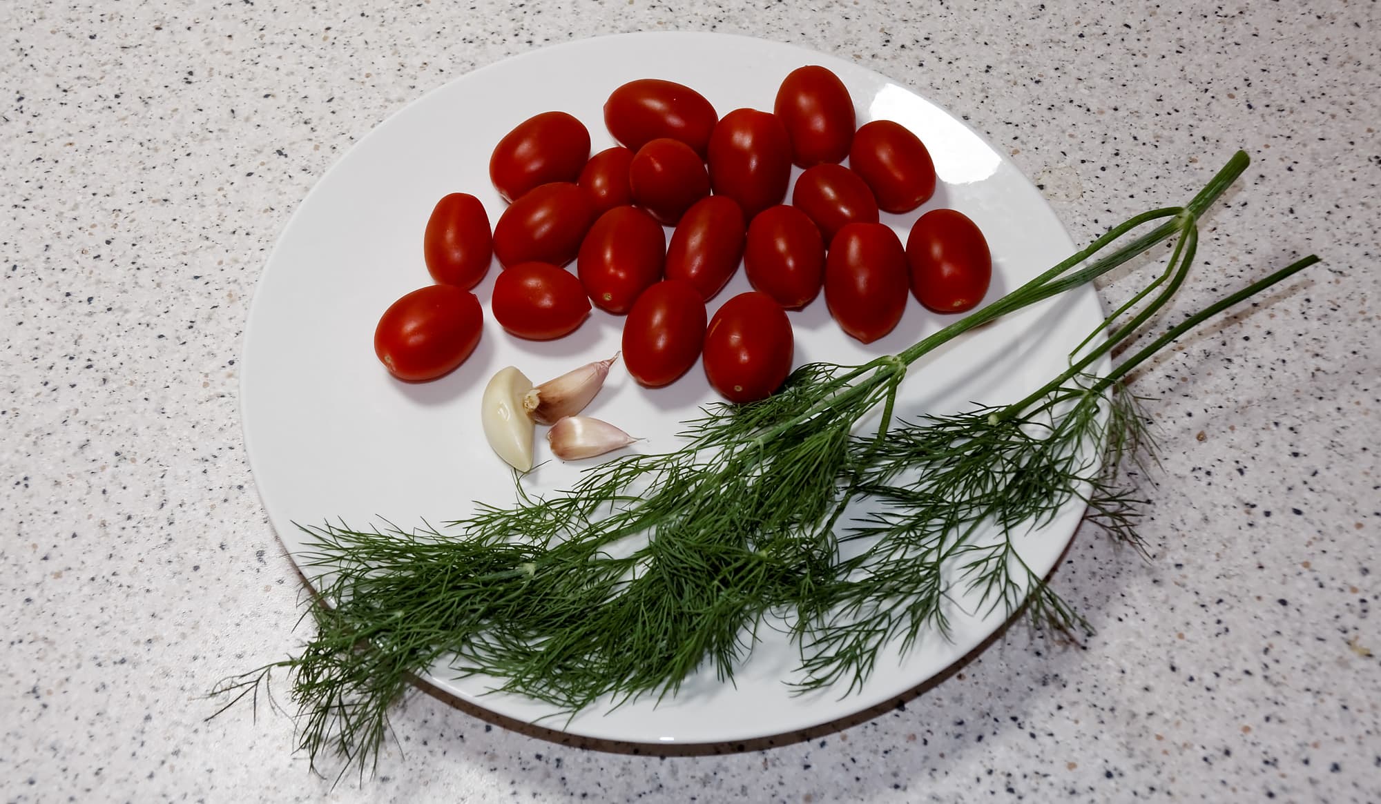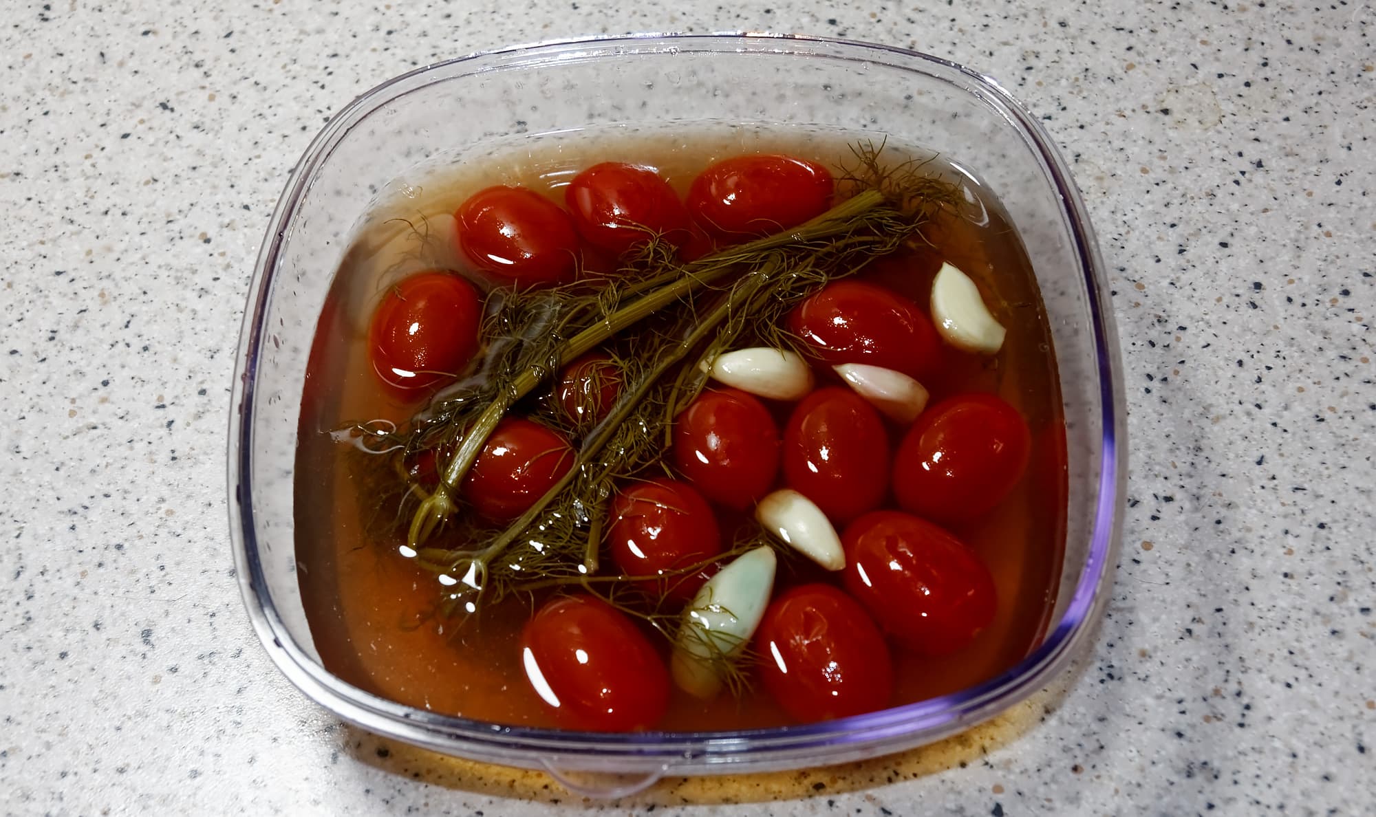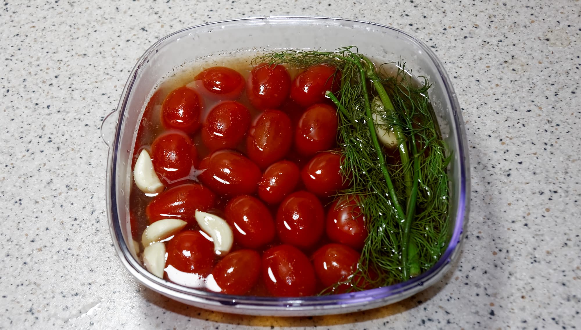 Помидоры черри поместили в контейнер, добавили укроп, чеснок и залили маринадом. Вакуумировали.