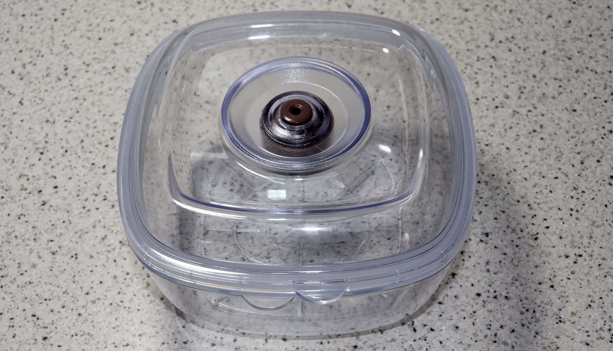 Крышка по краям имеет резиновую прокладку, обеспечивающую плотное прилегание. По центру расположен вакуумный клапан, к которому производится подключение шланга. Для разгерметизации контейнера достаточно нажать на кнопку клапана.