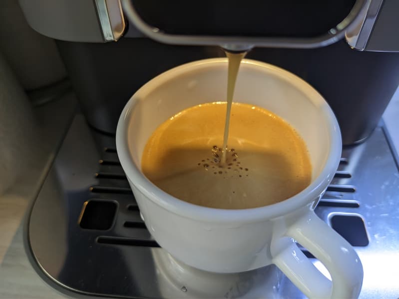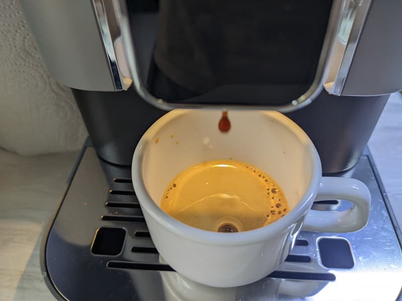 «Крепкий» эспрессо (на самом деле — вполне обычный) получается вполне достойным. По вкусу напиток получается похожим на то, что варят автоматы DeLonghi на средних (стандартных) настройках.