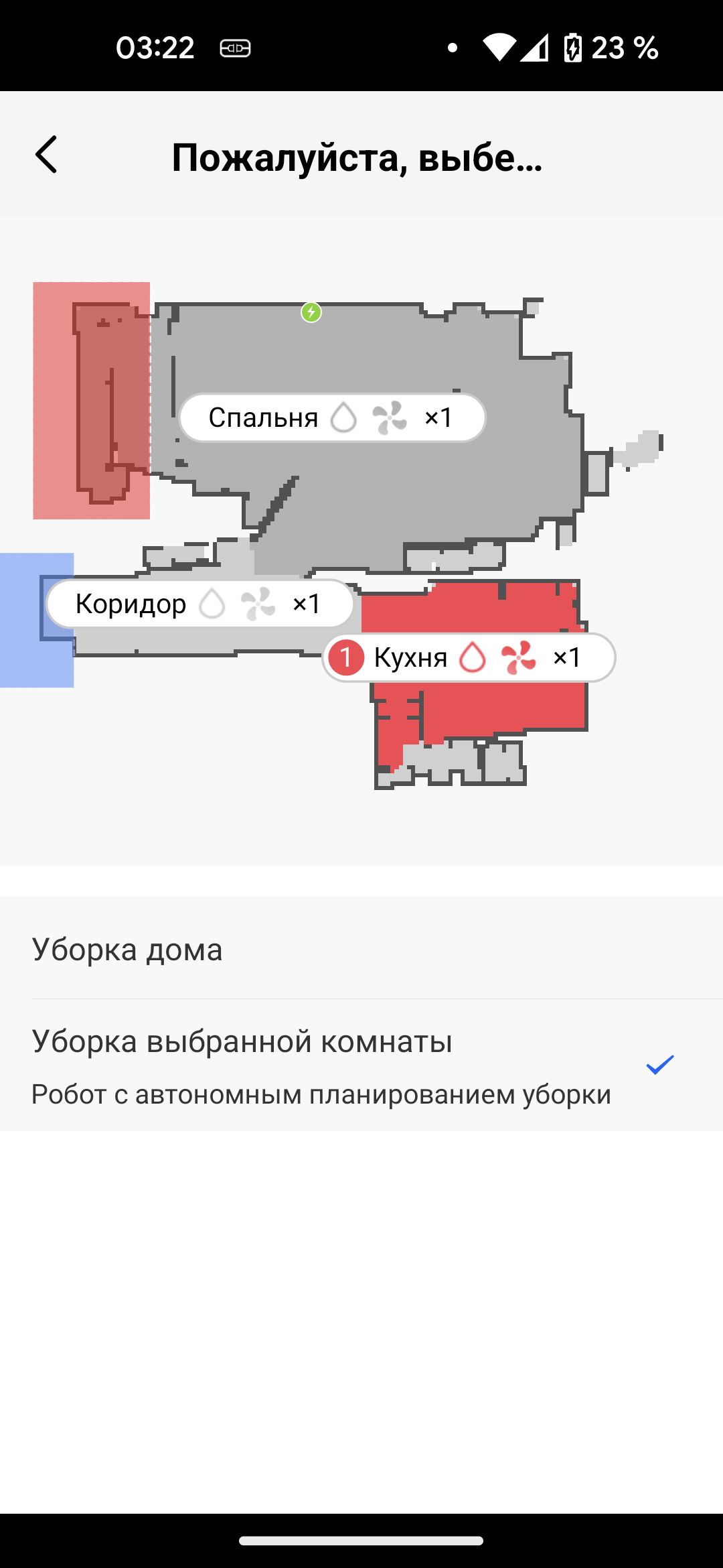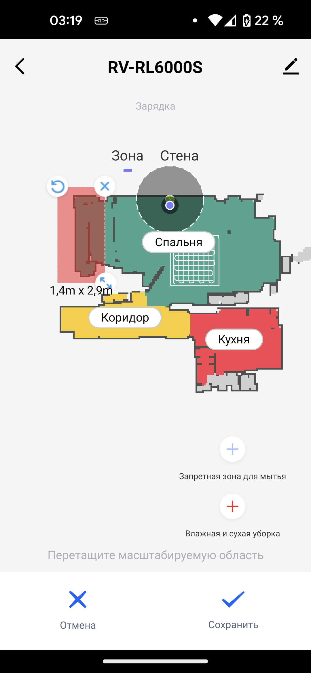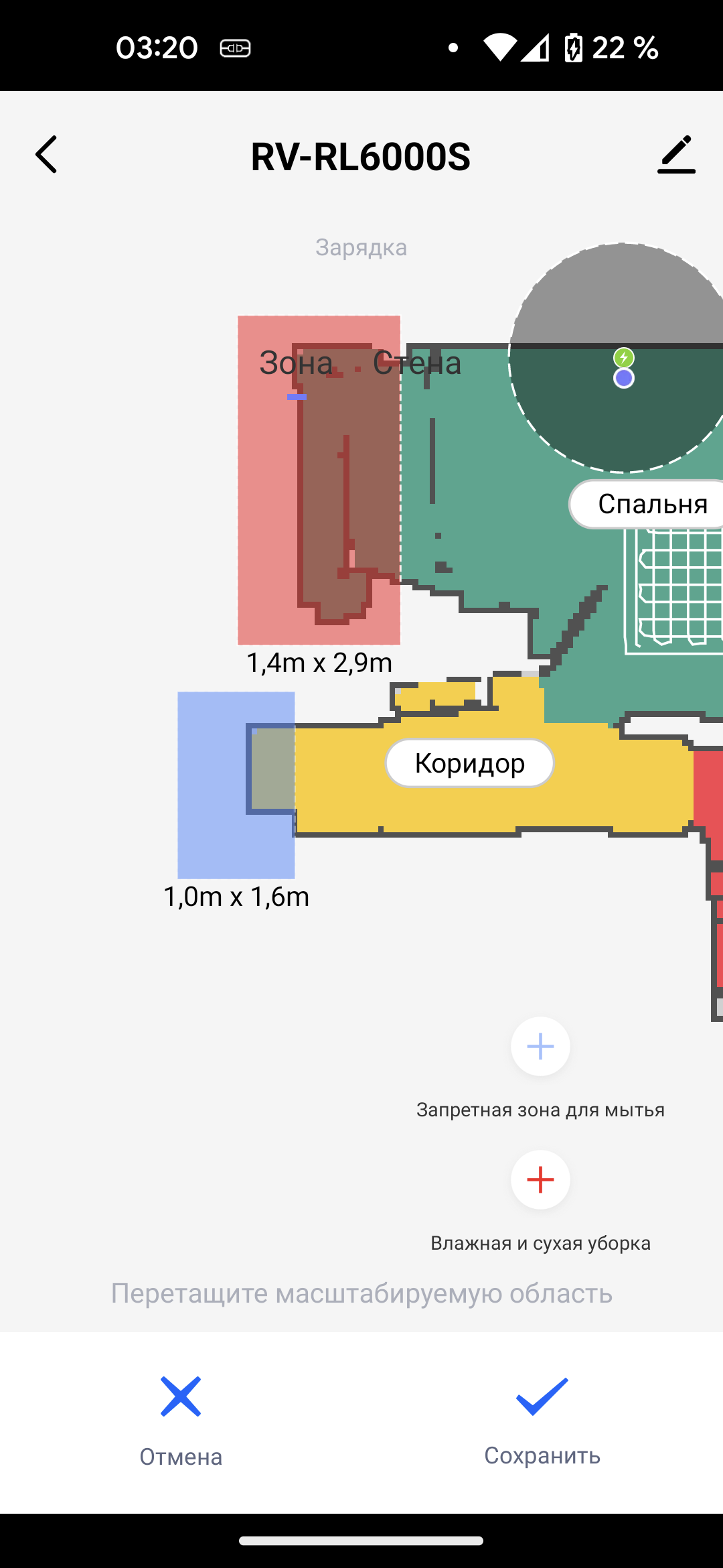 Красный прямоугольник обозначает область, запретную и для сухой, и для влажной уборок, а синий запрещает только мытье пола. Мы запретили роботу протирать в коридоре у входной двери: там лежит придверный коврик, мыть который нежелательно..
