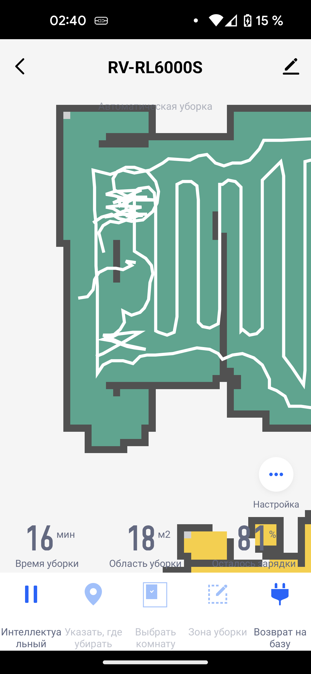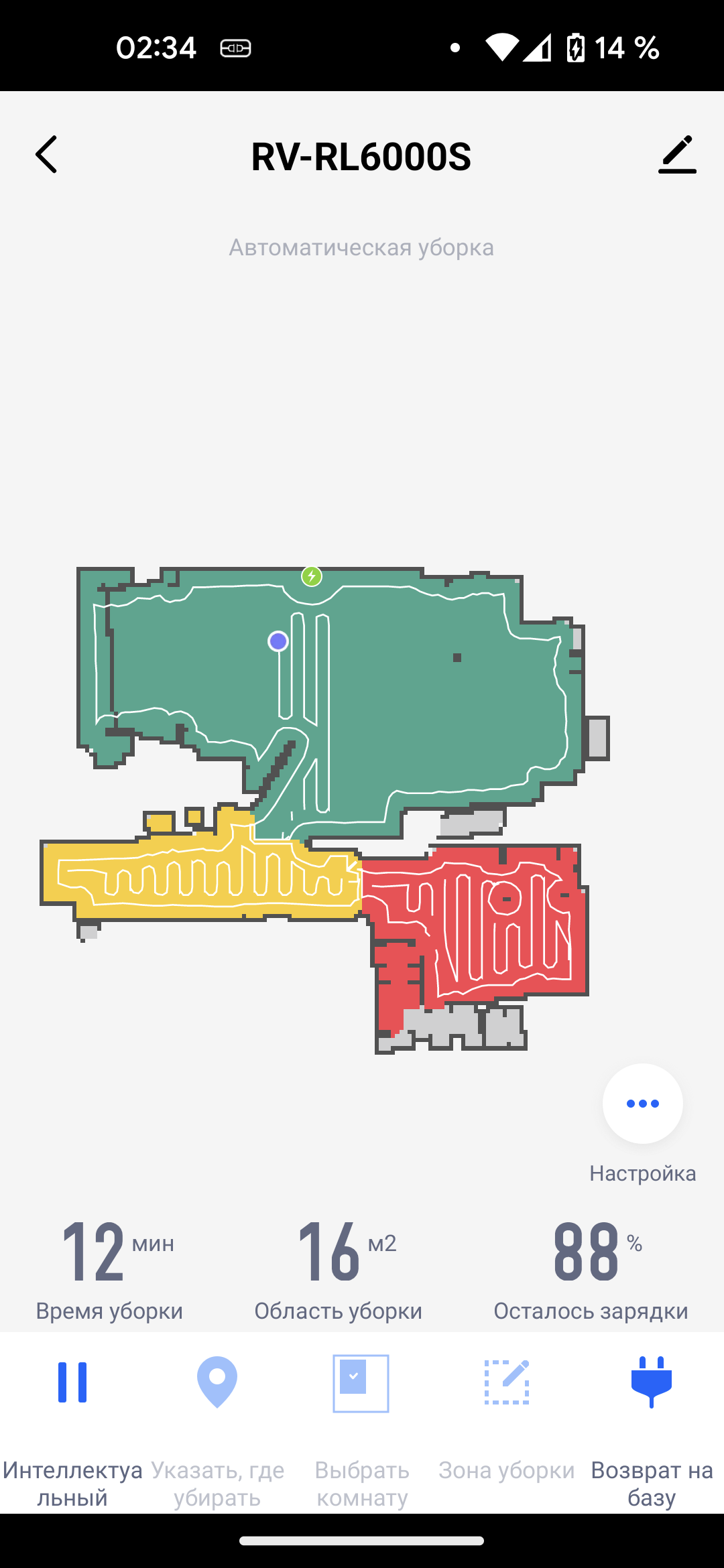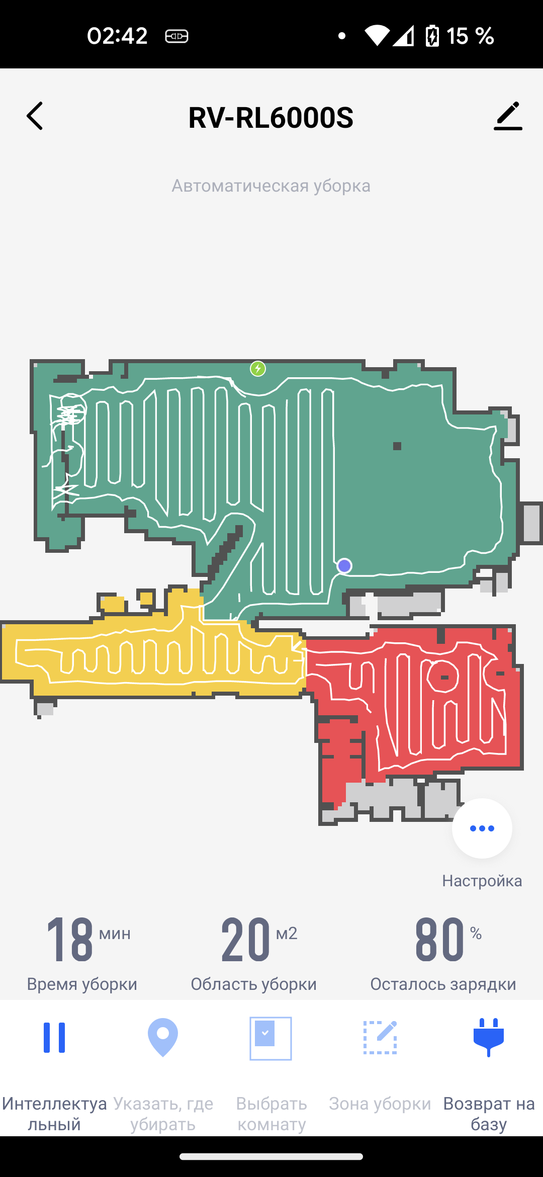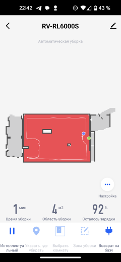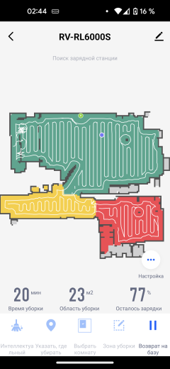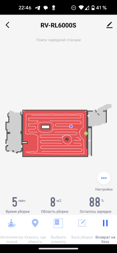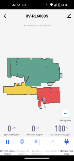 На главном экране приложения отображается точная и подробная карта помещения. На ней синей точкой отмечен наш пылесос, а зеленой — база. Под картой выводится информация о времени текущей (либо последней) сессии, обработанной площади и заряде аккумулятора.