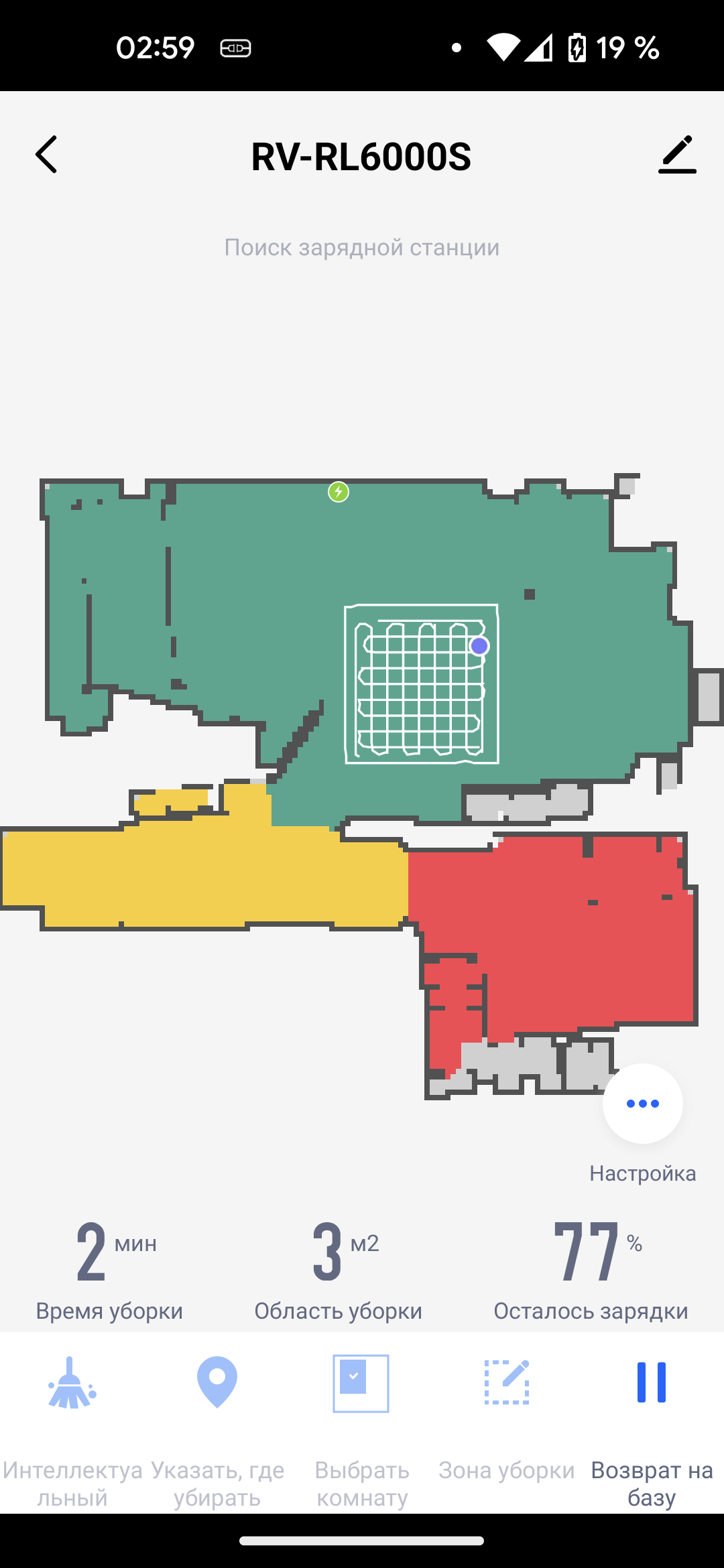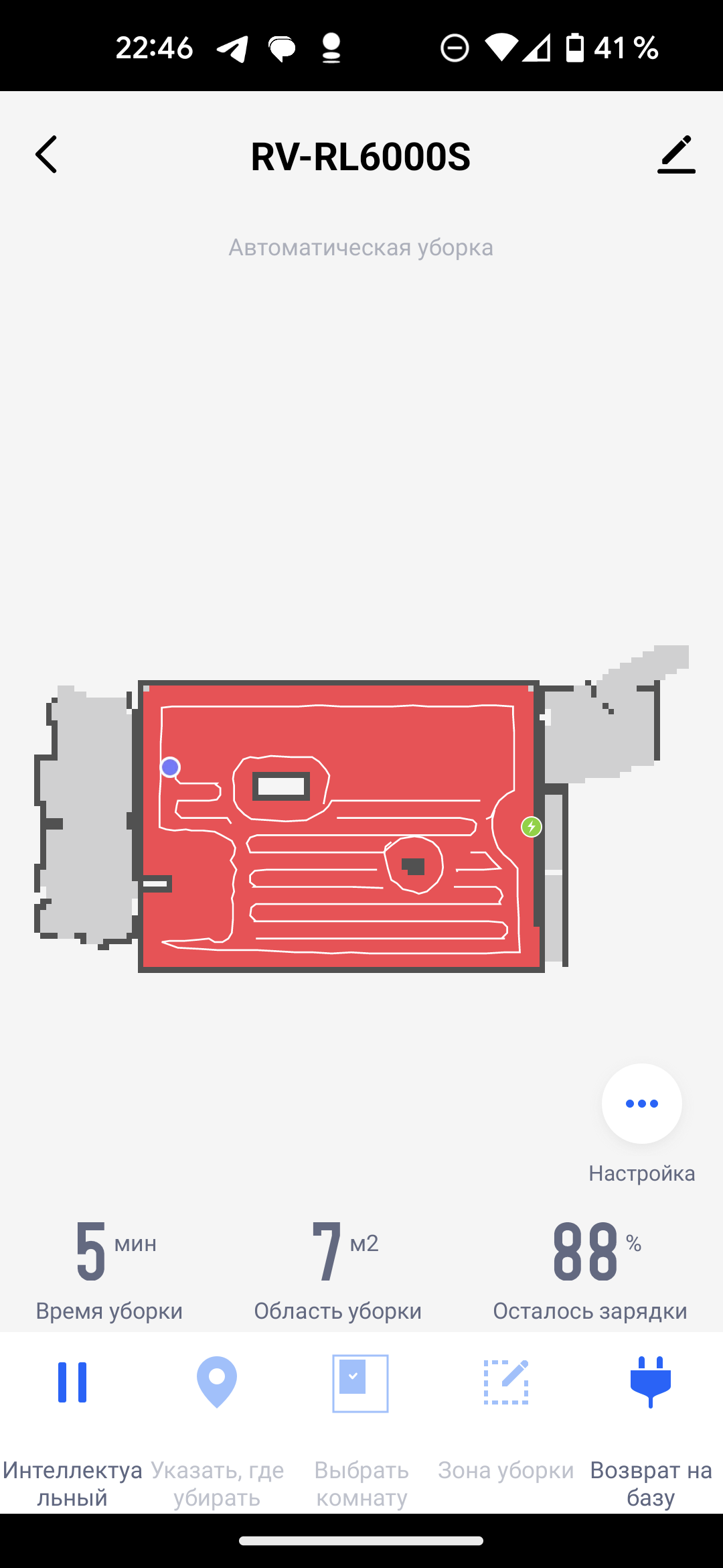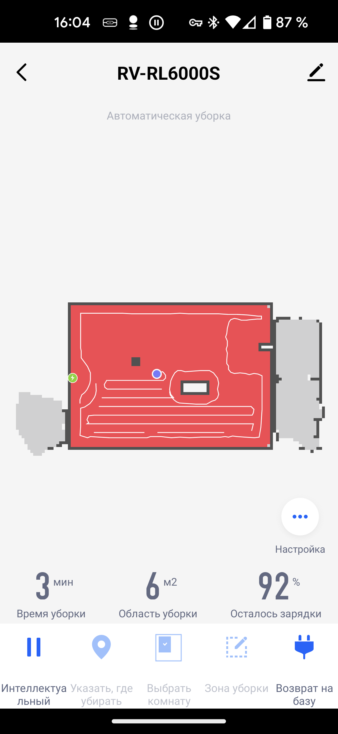 На главном экране приложения отображается точная и подробная карта помещения. На ней синей точкой отмечен наш пылесос, а зеленой — база. Под картой выводится информация о времени текущей (либо последней) сессии, обработанной площади и заряде аккумулятора.