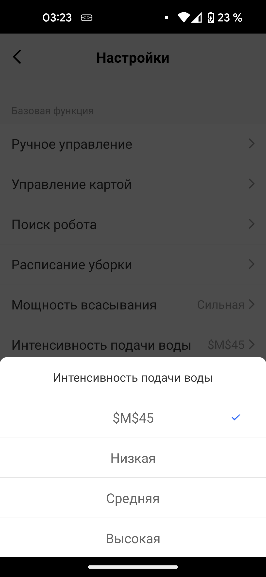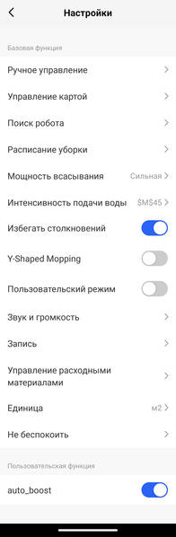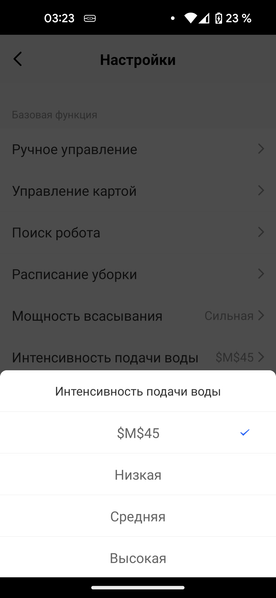 В настройках можно установить интенсивность подачи воды при влажной уборке, выбрав один из четырех уровней — верхнему значению, как мы установили экспериментально, соответствует отключенное увлажнение. Еще тут есть возможность отрегулировать мощность всасывания (только подметание, минимальная, средняя и максимальная мощность).