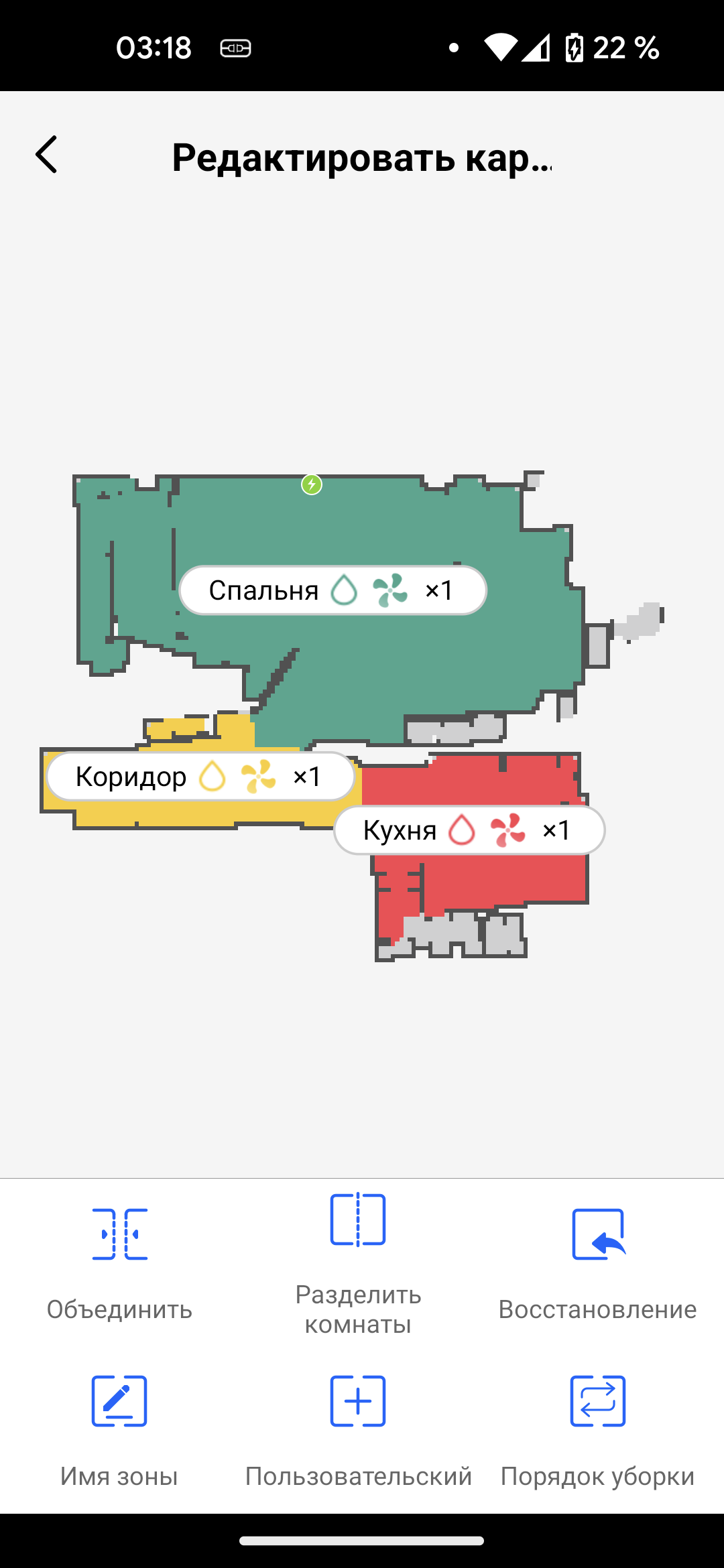 Если автоматическая разбивка квартиры оказалась неверной, на помощь придет инструмент «редактирование карты». Здесь можно объединить, разделить и переименовать комнаты. По умолчанию пылесос начинает плановые уборки в том помещении, где установлена база, но если это по какой-либо причине окажется неудобным, последовательность обхода комнат можно изменить.