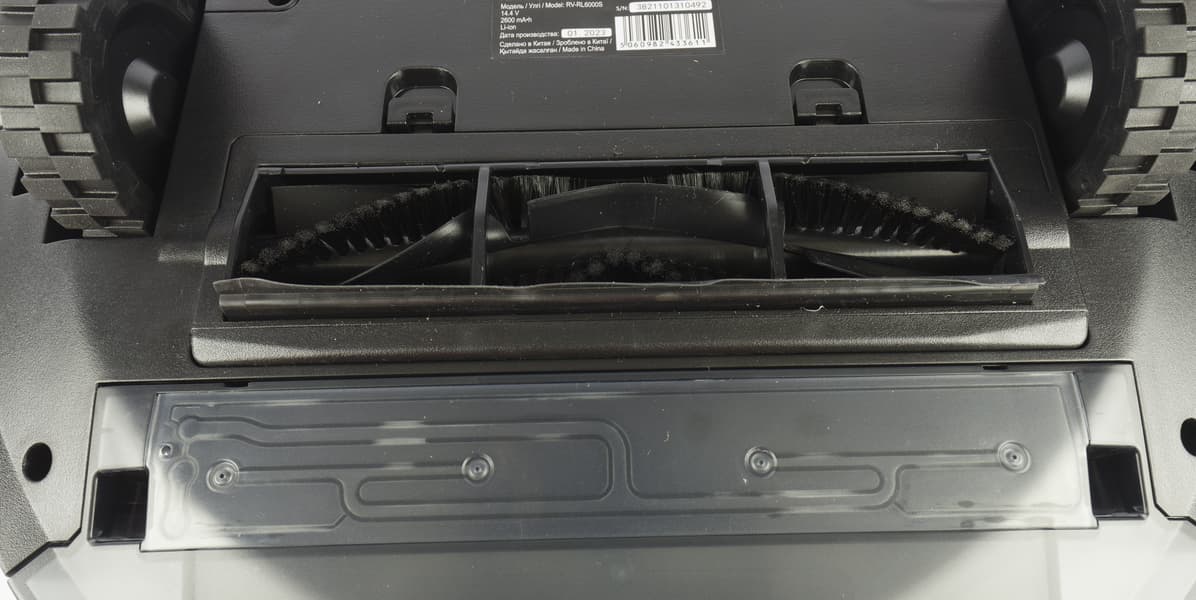 На рамке центральной щетки — два пластиковых элемента, защищающие ротор от случайного наматывания проводов и прочих инородных предметов. К задней части прикреплен резиновый уплотнитель, улучшающий прилегание к полу.