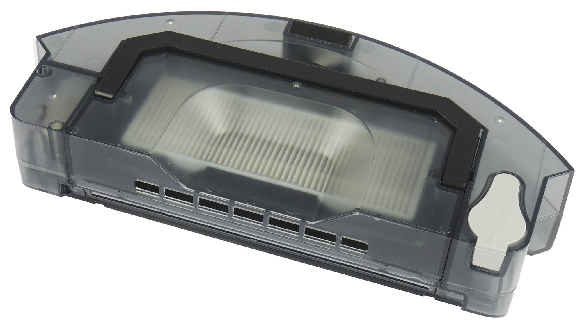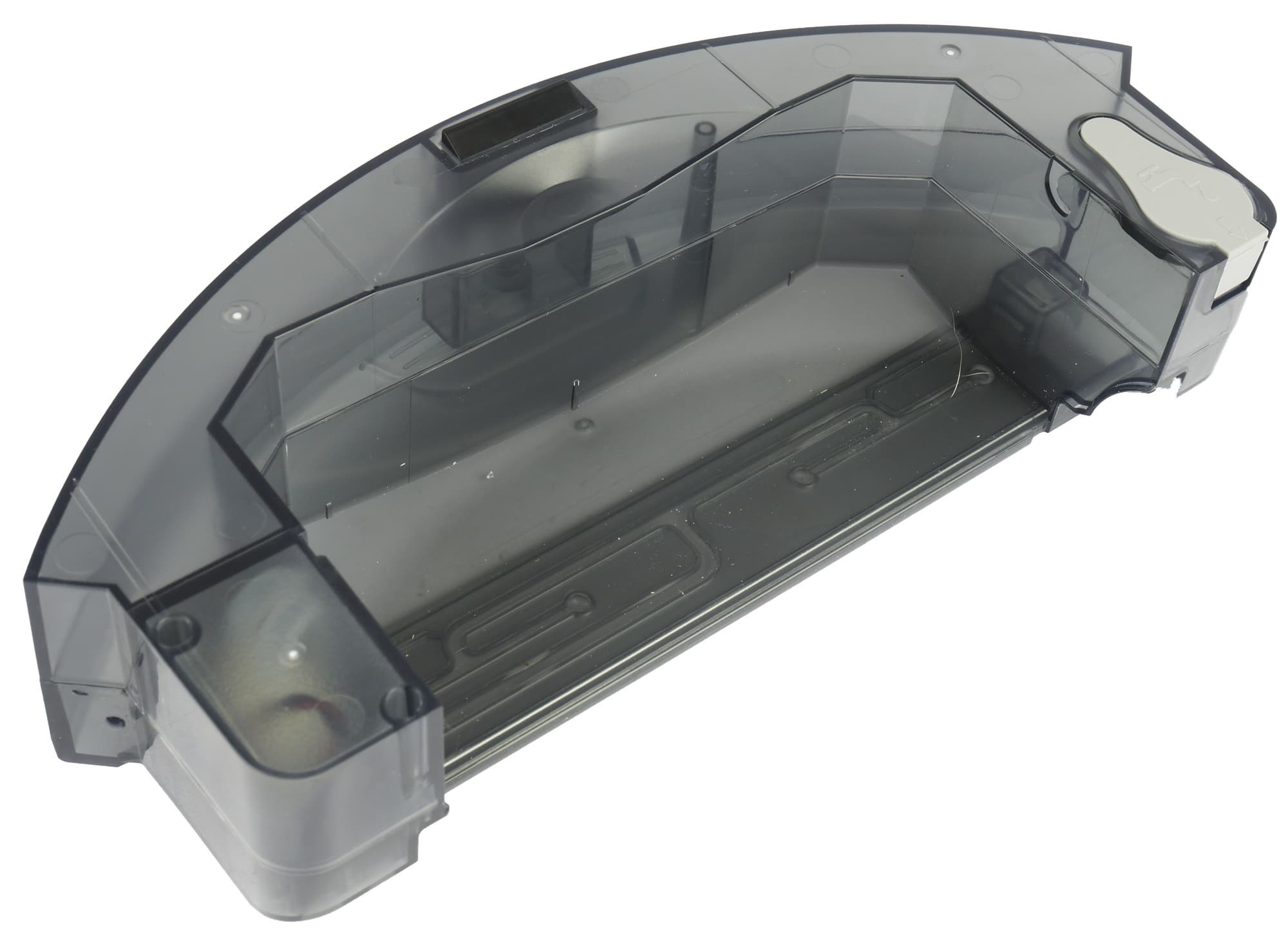 Отсек контейнера для сухой и влажной уборки устанавливается в корме робота. Совмещенный с резервуаром для воды мусоросборник удерживает пластиковая защелка, а снизу к нему крепится D-образный держатель салфетки для влажной уборки.