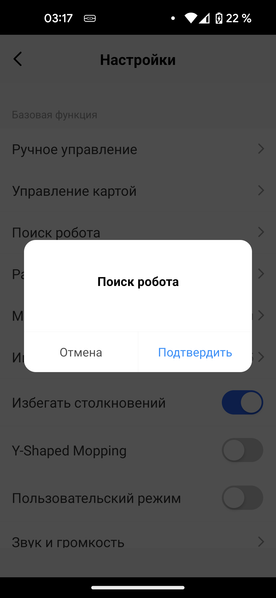 С помощью пункта «Поиск робота» можно заставить потерявшееся в квартире устройство подать звуковой сигнал и обнаружить себя.