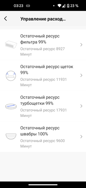 Пункт «Управление расходными материалами» предлагает узнать о ресурсе HEPA-фильтра, боковых и центральной щетки, а также салфетки для влажной уборки. Данные представлены в виде процентов износа и остаточного ресурса в минутах. При замене расходников нужно обнулить сервисный интервал в приложении.