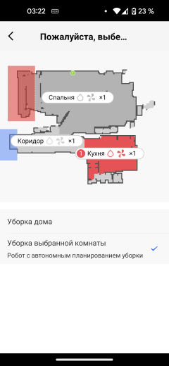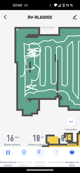 Кнопка «Указать, где убирать» позволяет отправить устройство подмести квадратный участок пола со стороной около полутора метров. При этом пылесос обходит указанное место сначала по периметру, потом «змейкой» вдоль, а затем поперек. Аналогичным образом работает и кнопка «зона уборки», но здесь размер прямоугольника пользователь может задать произвольно.