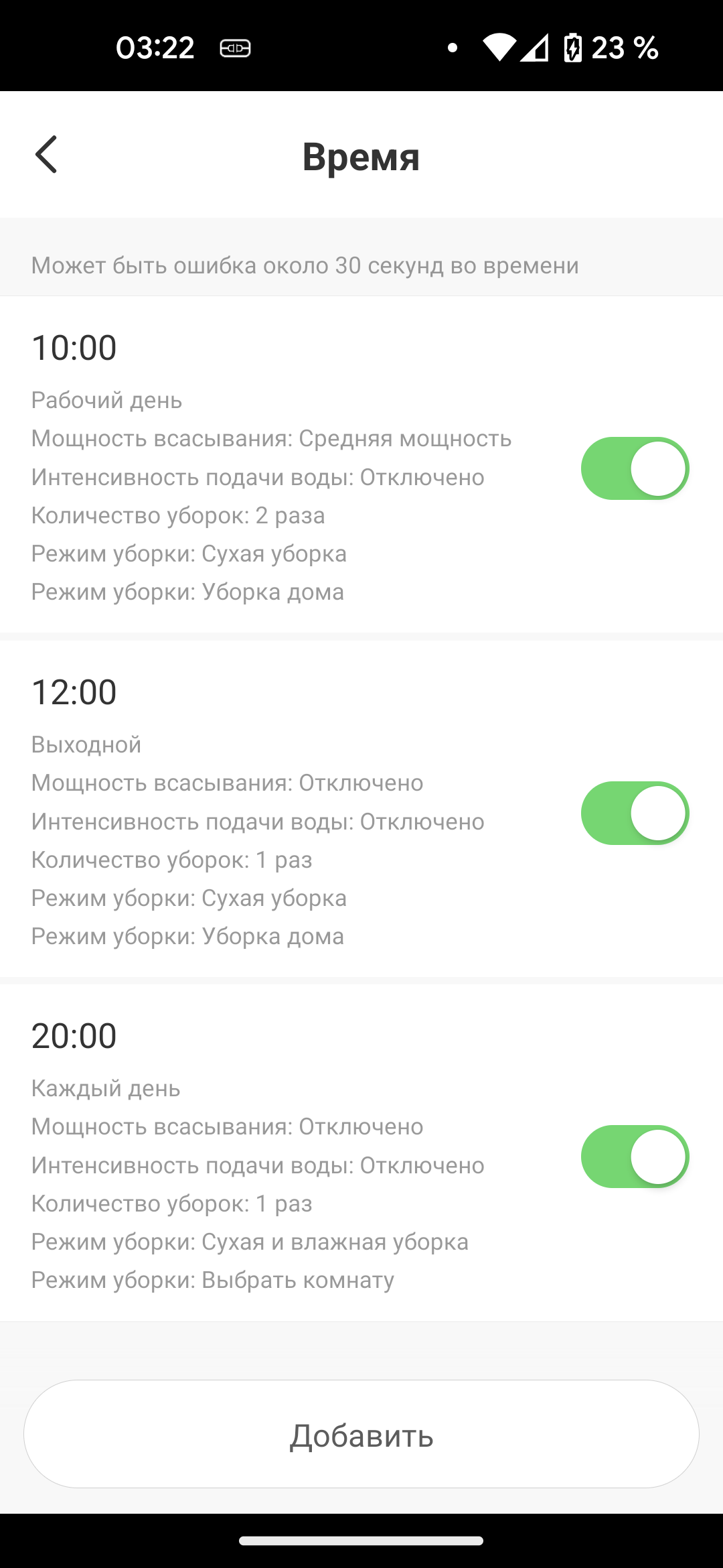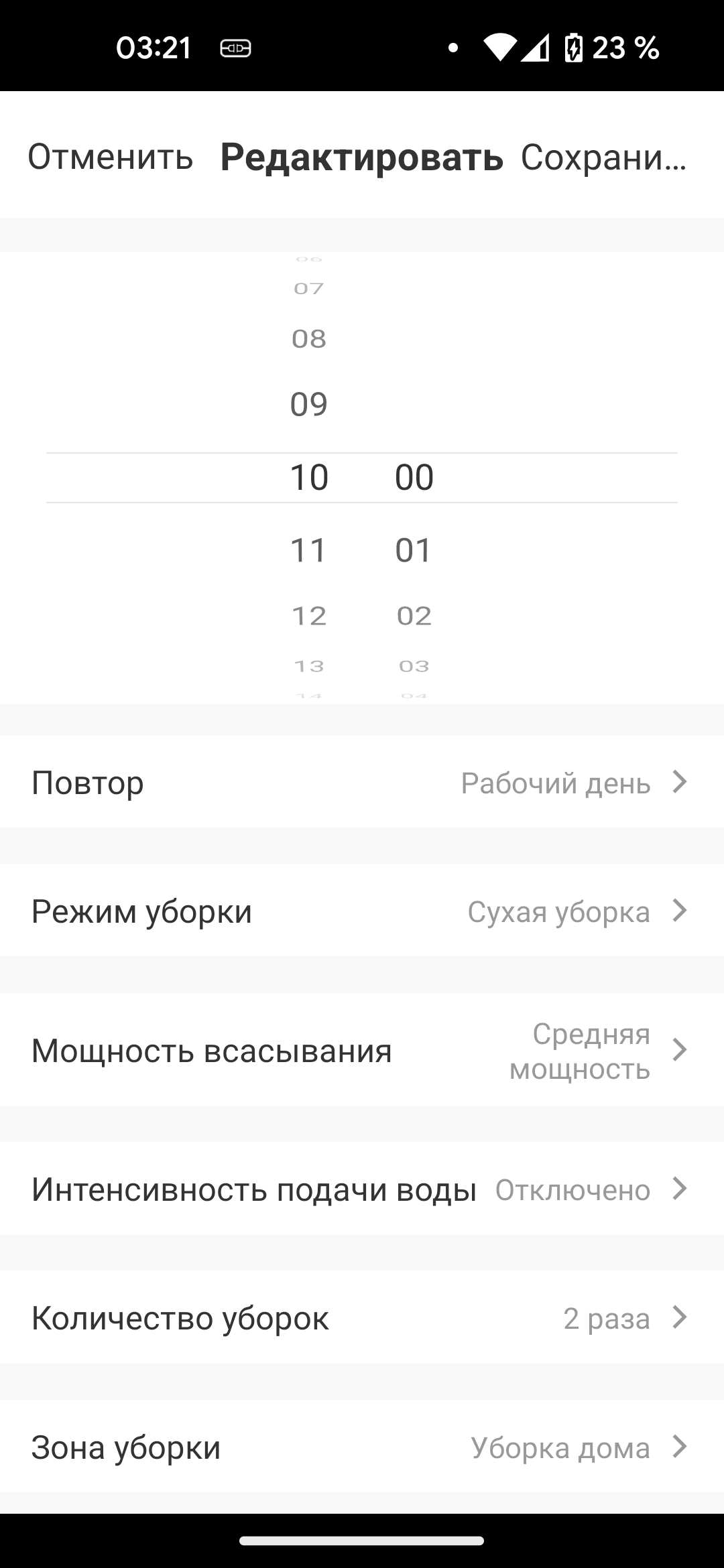 Здесь мы настроили полную уборку дома по будним дням в десять утра, а по субботам и воскресеньям, когда хочется поспать подольше, — в полдень. Вечером, после ужина, пылесос отправляется на кухню и прибирается только в этом помещении.