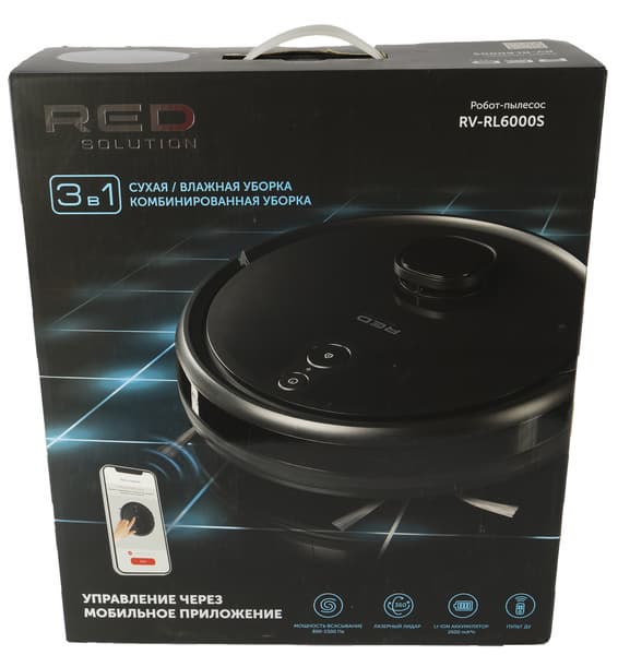 Робот-пылесос приехал к нам в черной картонной коробке с полноцветной печатью. Для удобства переноски упаковка снабжена ручкой. На верхней крышке изображено устройство в действии. Здесь же производитель перечисляет основные особенности модели: возможность сухой, влажной и комбинированной уборки и управление через мобильное приложение. Также упомянуты мощность всасывания (от 800 до 2300 Па), навигация с помощью лидара, литий-ионный аккумулятор мощностью 2600 мА·ч и пульт дистанционного управления.