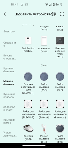 Теперь можно начать синхронизацию приложения с пылесосом. Воспользовавшись кнопкой «добавить устройство», мы выбираем «Робот-пылесос (Wi-Fi)» из длинного списка поддерживаемых приборов. Производитель принял решение не разрабатывать приложение с нуля, а воспользовался одним из популярных фреймворков — этот интерфейс мы уже встречали.