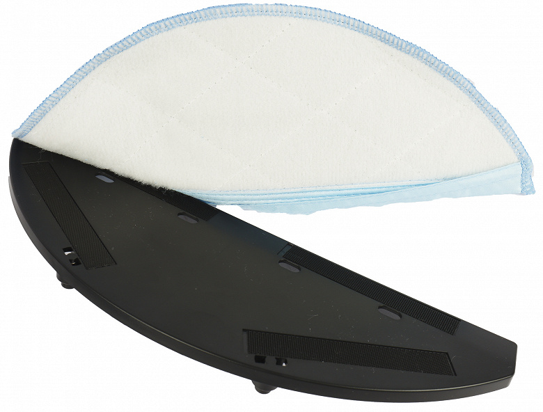 Снизу у мусоросборника есть съемная рамка, на которую c помощью липучек-велкро крепится микрофибровая D-образная тряпка для мытья пола. Вода из резервуара попадает на нее сквозь четыре сквозных отверстия овальной формы.