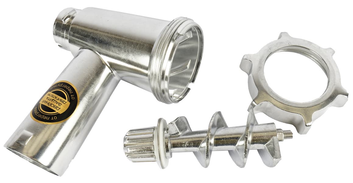 Горловина, шнек и закрепляющая гайка мясорубки выполнены из силумина. Все детали выглядят аккуратно, собирается блок просто и быстро.