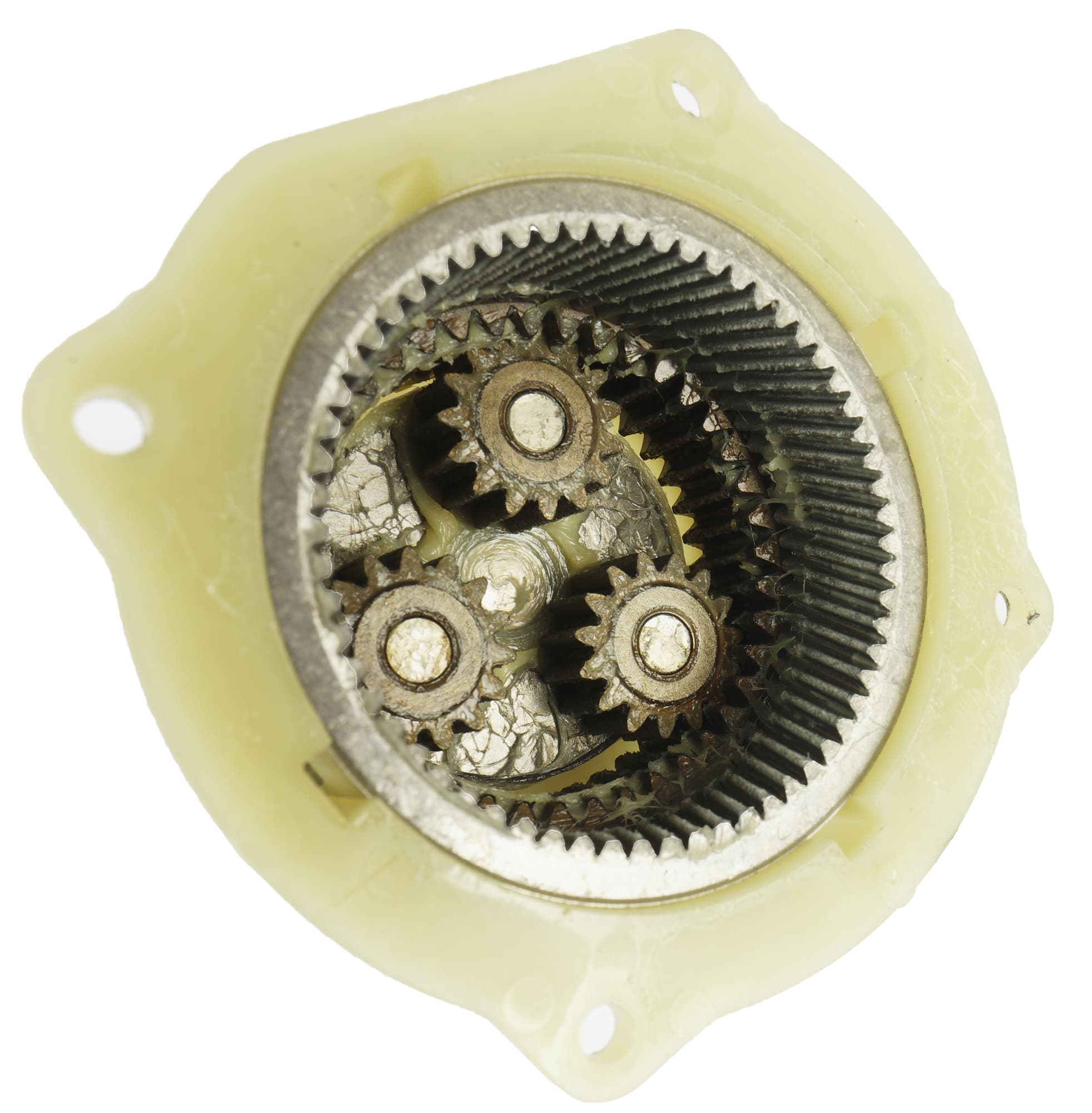 Когда мы их сняли, то обнаружили под ними сателлитные шестеренки поменьше. Эти шестеренки выполнены из металла, возможно, из стали: