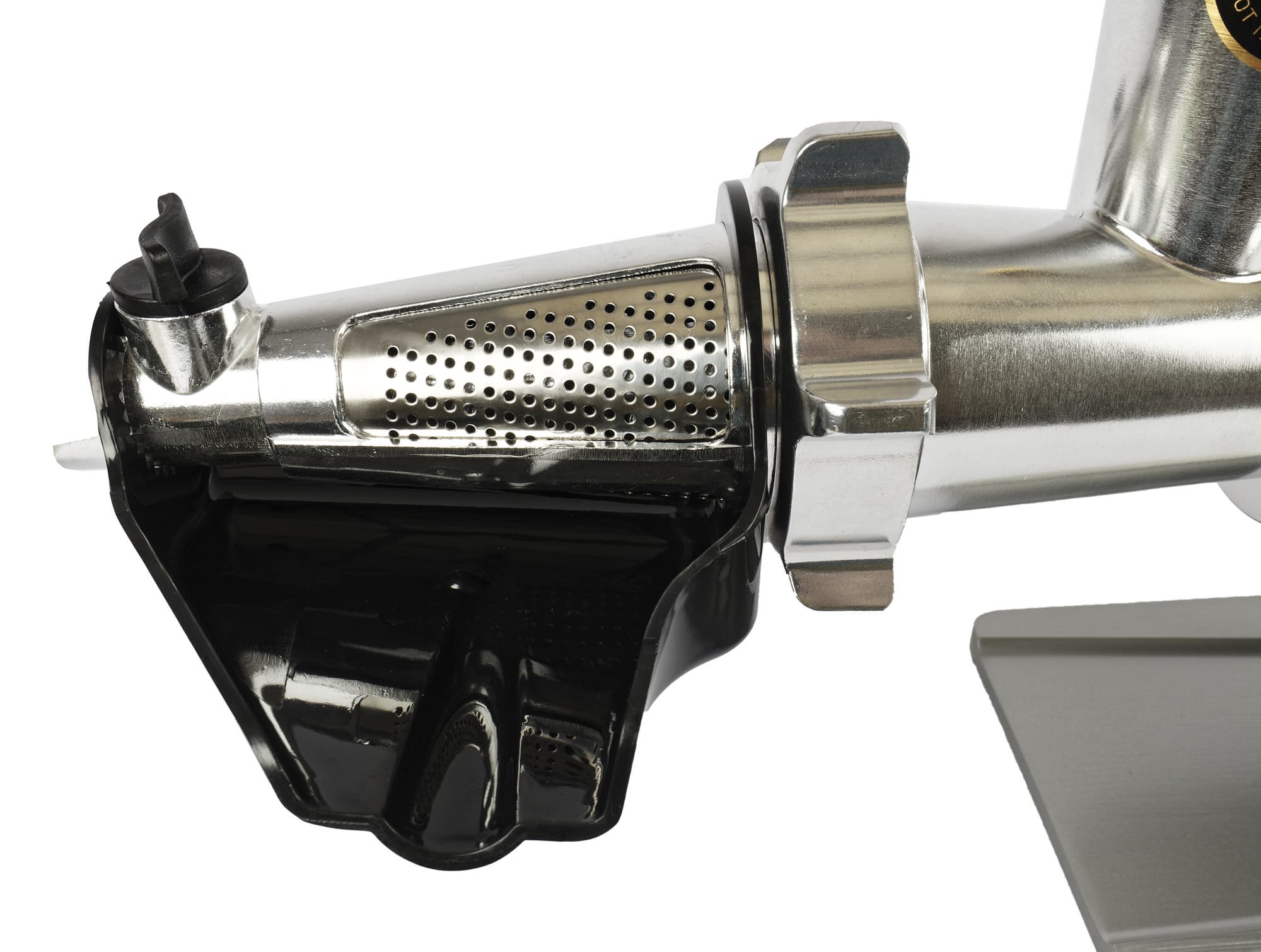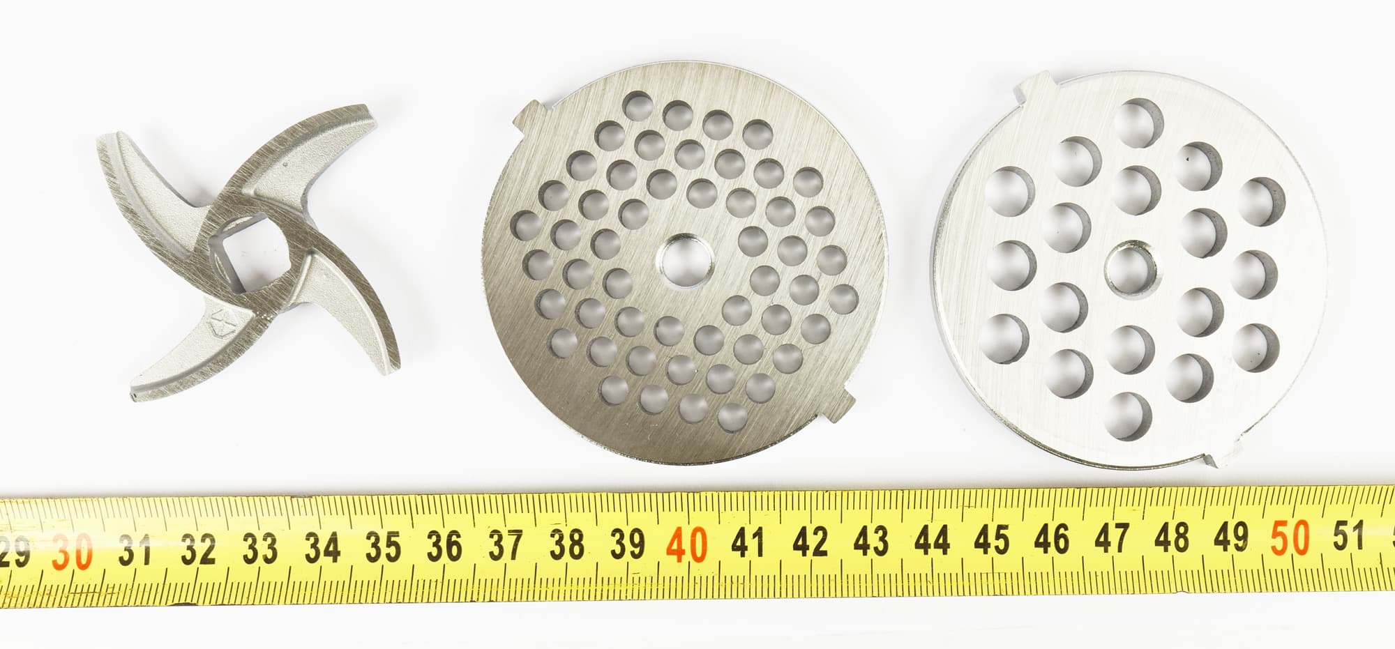 Стальные решетки и нож достаточно острые. В наборе две решетки, со средними и крупными отверстиями, 5 и 7 мм соответственно.