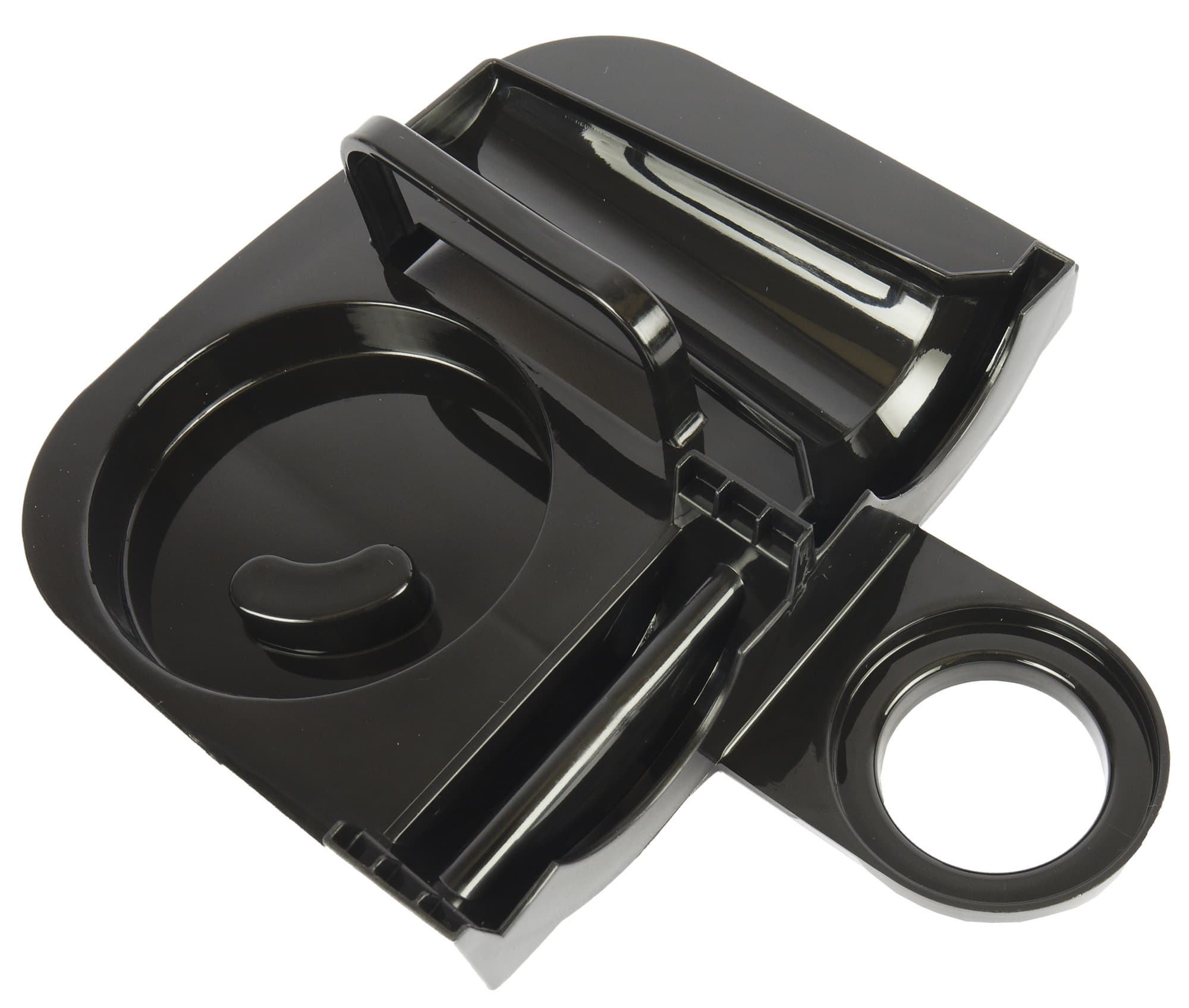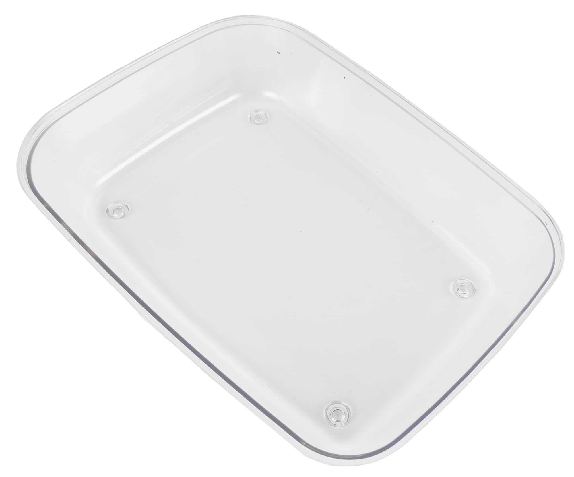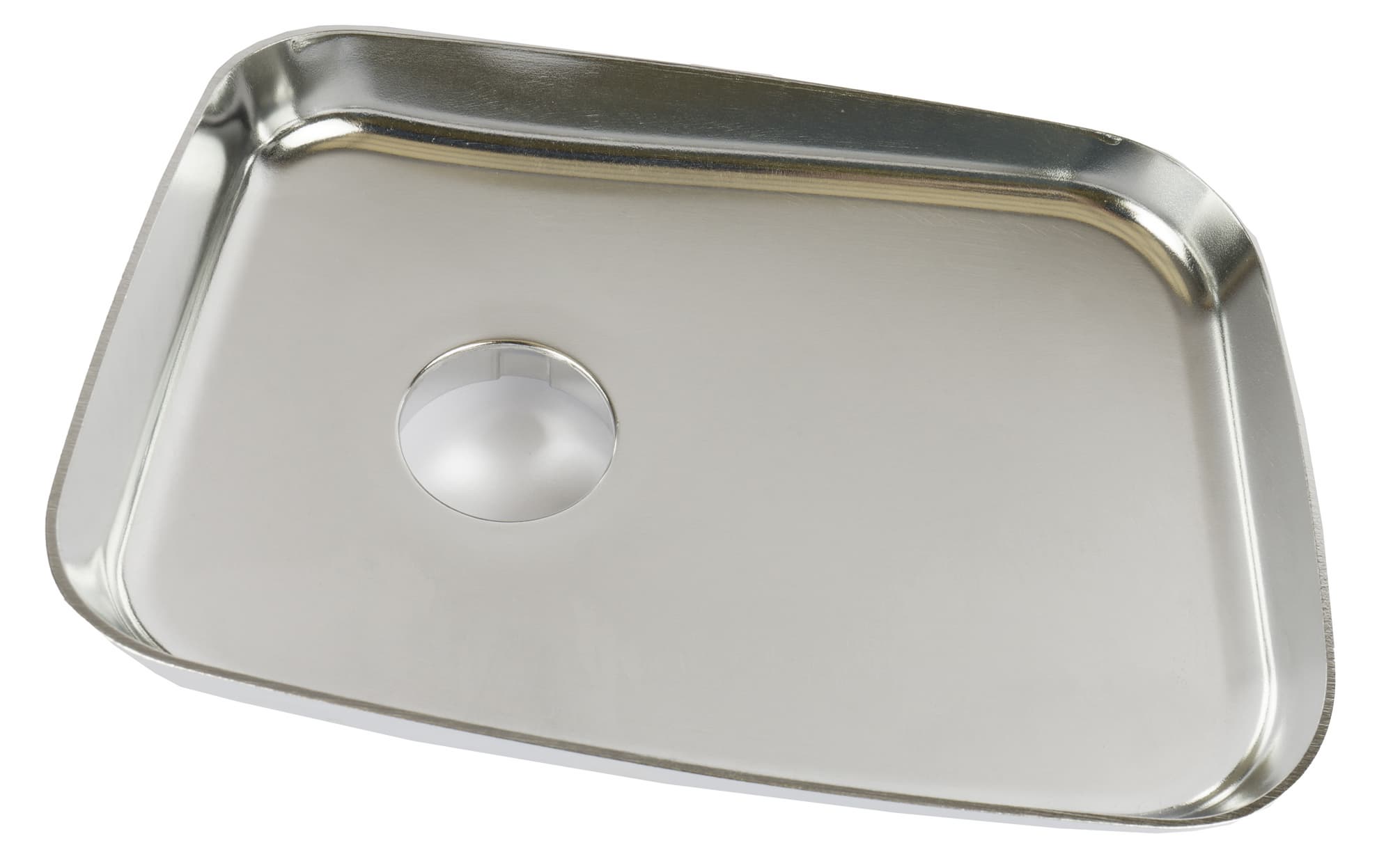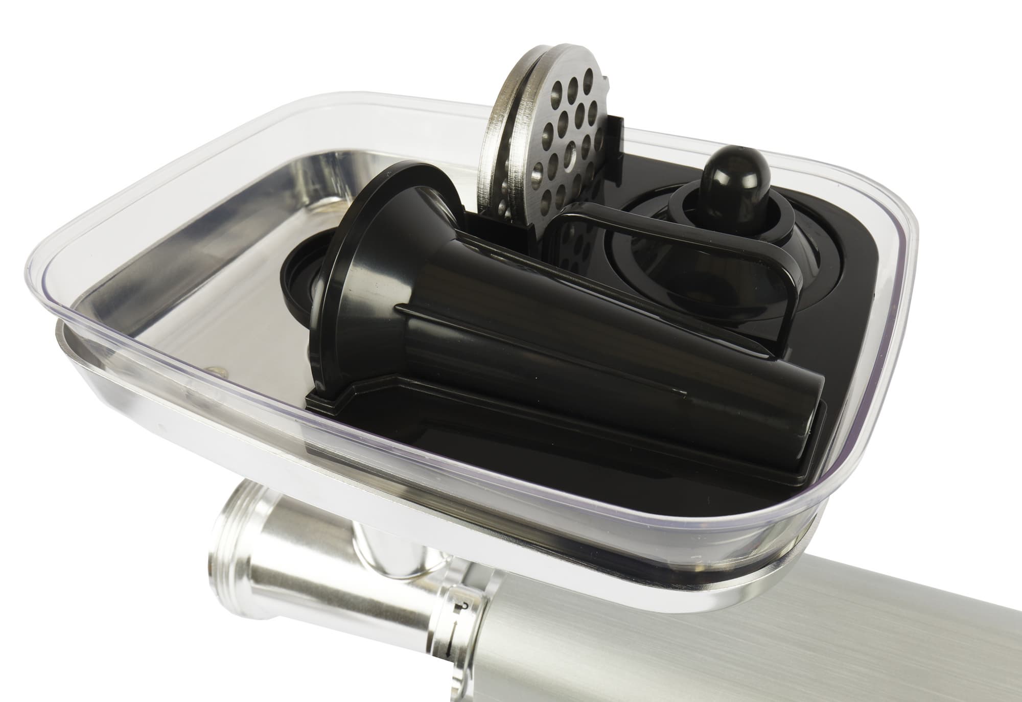 В эту систему хранения помещаются насадки для колбас и кеббе, решетки и толкатель мясорубки. Все эти аксессуары укладываются в загрузочный лоток и закрываются прозрачной крышкой. На фото ниже система хранения расположена на крышке, но лучше укладывать все аксессуары на металлический поддон, а пластиковым закрывать сверху, чтобы предохранить от пыли, неизбежной на кухне.