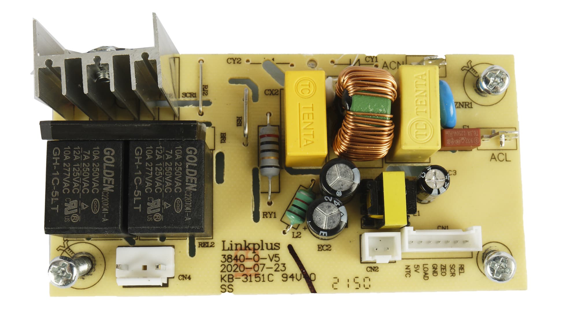 Когда мы рассмотрели все, что входило в коробку с мясорубкой, мы решили посмотреть, что у нее внутри, и обнаружили вентилятор, решетку которого мы видели выше, и электронную плату, обеспечивающую управление мясорубкой.