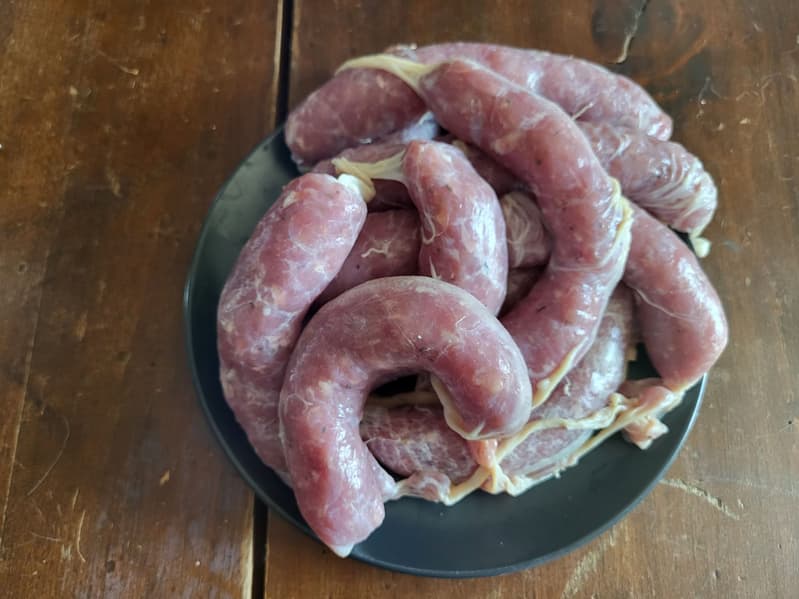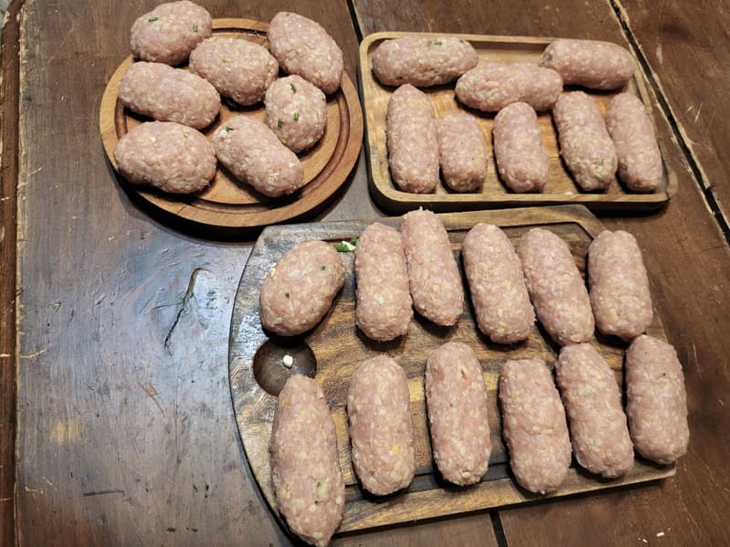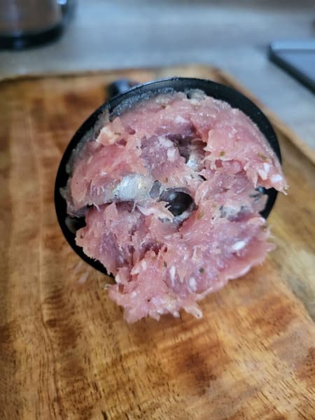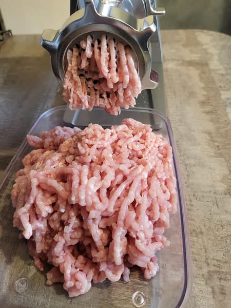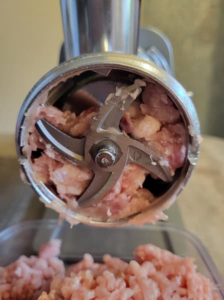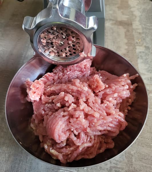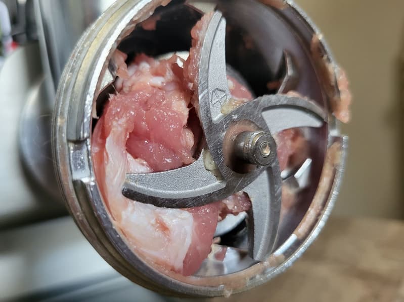Для приготовления колбасок мы снова смололи фарш в мясорубке.