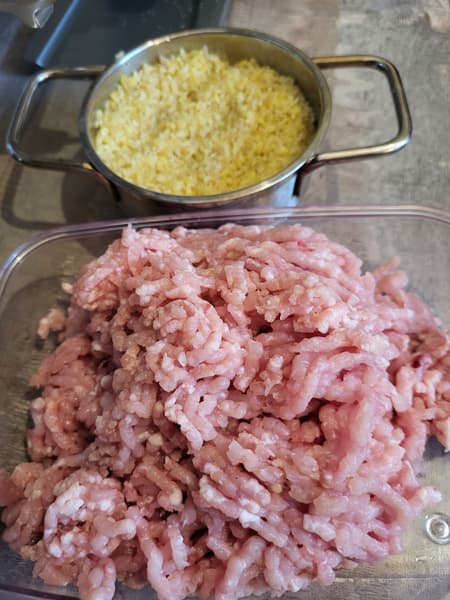Как и в предыдущих рецептах, мы начали с приготовления фарша, а пока готовился фарш, замочили в холодной воде булгур. В одних рецептах говорят, что надо замачивать на 40 минут, в других — на 3-4 часа, мы замочили булгур на час.