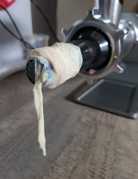 Насадка исправно работала и выдавала трубочку — сантиметра на два. Потом трубочка разваливалась и превращалась в лист из фарша. Мы внимательно осмотрели и проверили насадку — все было в порядке. Попробовали еще раз — с тем же успехом. Тогда мы догадались, что дело не в мясорубке, а в фарше.