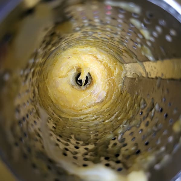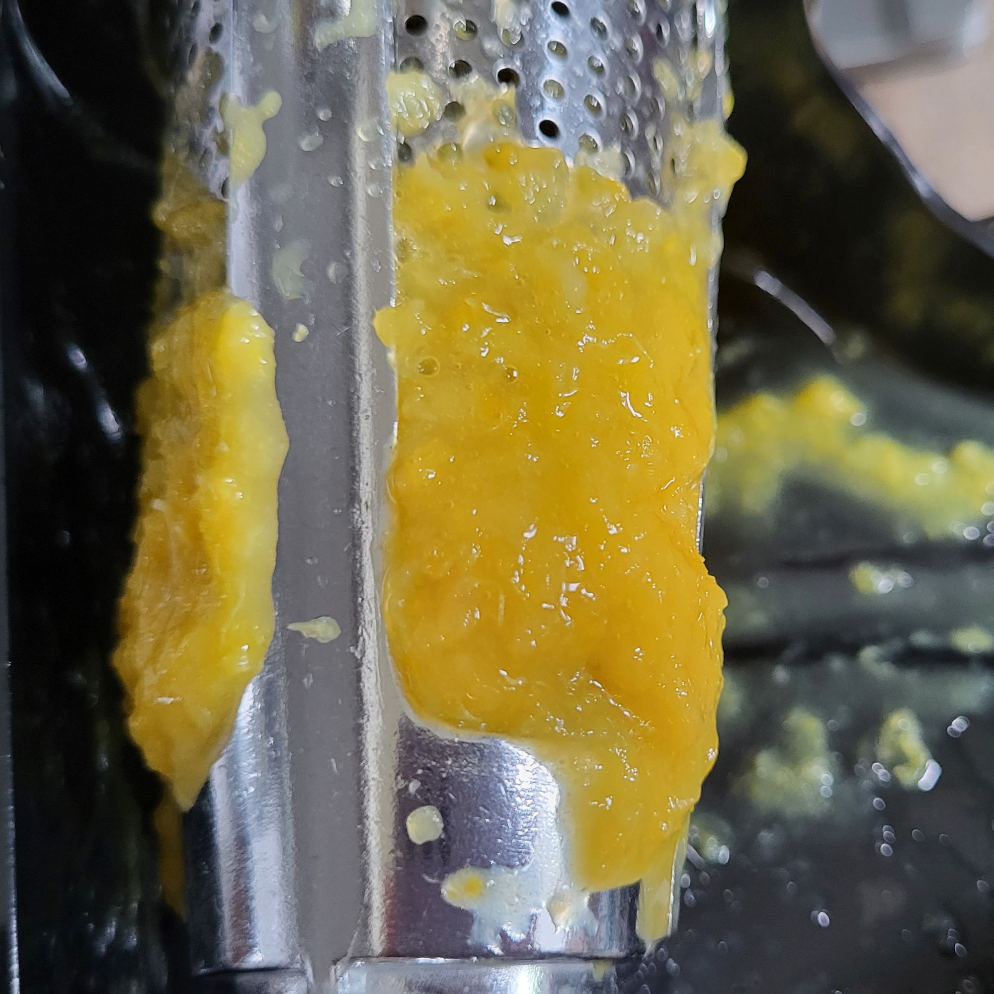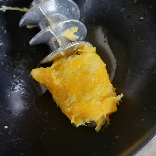 Сложнее было с внутренностью блока соковыжималки. На фото мы видим довольно много жмыха, вынимать который нам пришлось с помощью палочки для суши, и даже это было непросто. Жмых внутри спрессован и лежит довольно плотно. Выход жмыха можно регулировать с помощью винта на соковыжималке, но мы побоялись, что вместе со жмыхом выльется и весь сок.