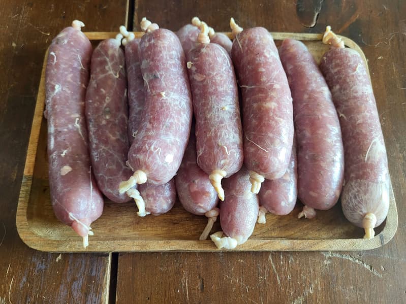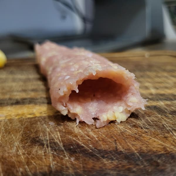 Тем не менее, плотность и равномерность колбасы легко откорректировать при завязывании хвостиков: просто пальцами равномерно распределить фарш. Черева при этом не рвется, что приятно.