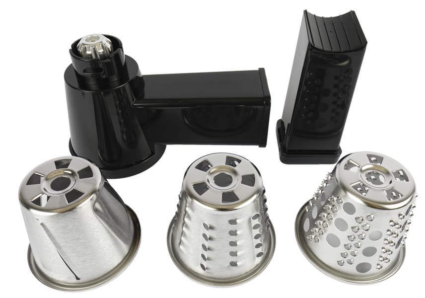 Блок овощерезки состоит из корпуса овощерезки, толкателя, набора из двух терок, мелкой и крупной, и шинковки.