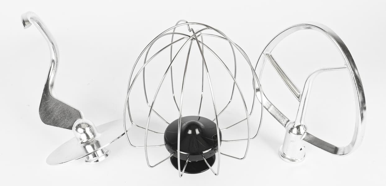 Комплект насадок для планетарного миксера состоит из венчика для взбивания, лопатки для перемешивания (почему-то в инструкции ее обозначили, как лопатку для взбивания) и крюка для замешивания тугого теста.
