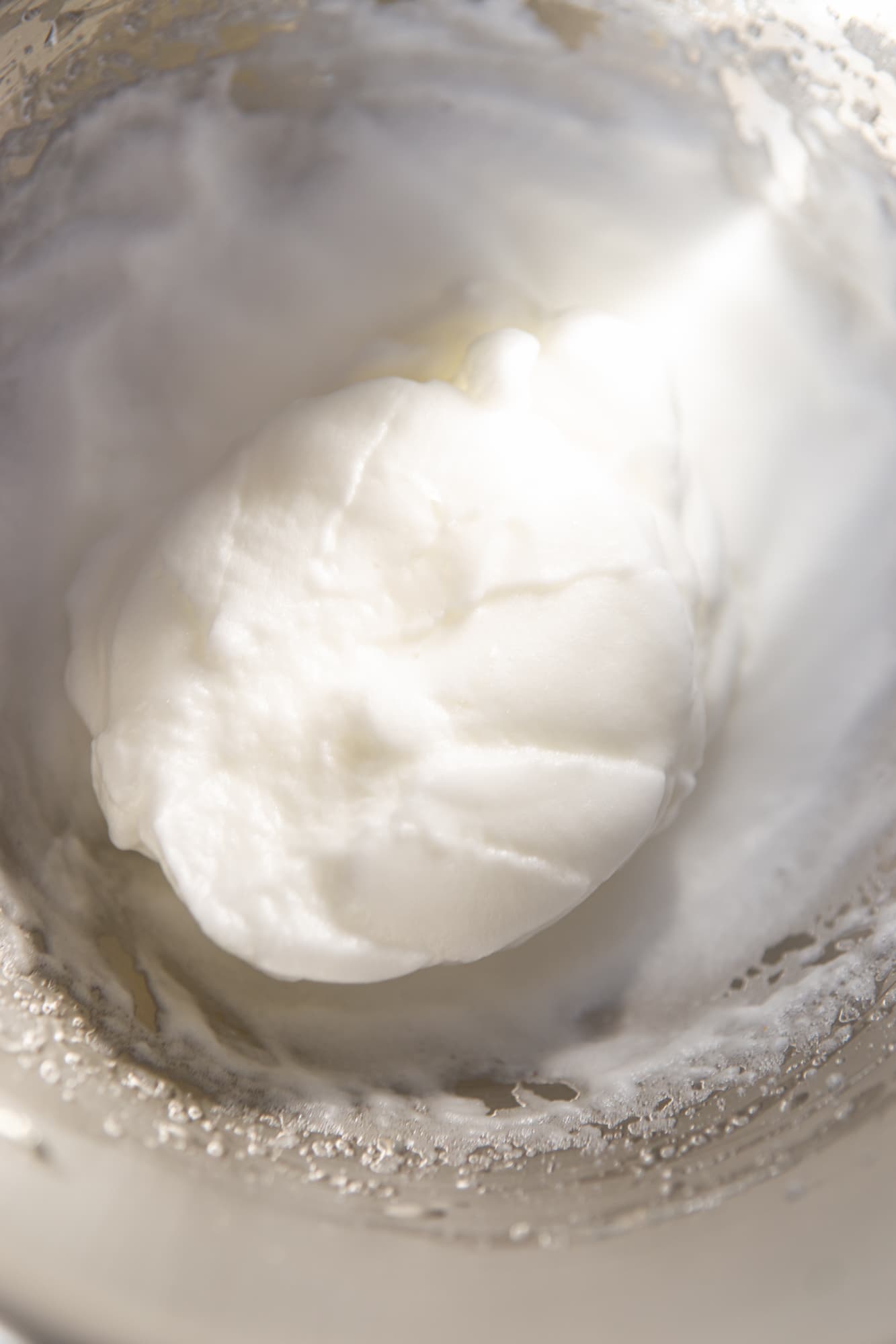 Еще до начала эксплуатации, при визуальном осмотре конструкции кухонной машины, мы обратили внимание, что венчик почти касается дна чаши, а значит — можно попробовать взбить самый минимум. Поместили в чашу два белка общим весом 80 граммов. Начали взбивать на 3-й скорости, затем перешли на 5-ю и уже через 4,5 минуты получили отличную густую крепкую пену.