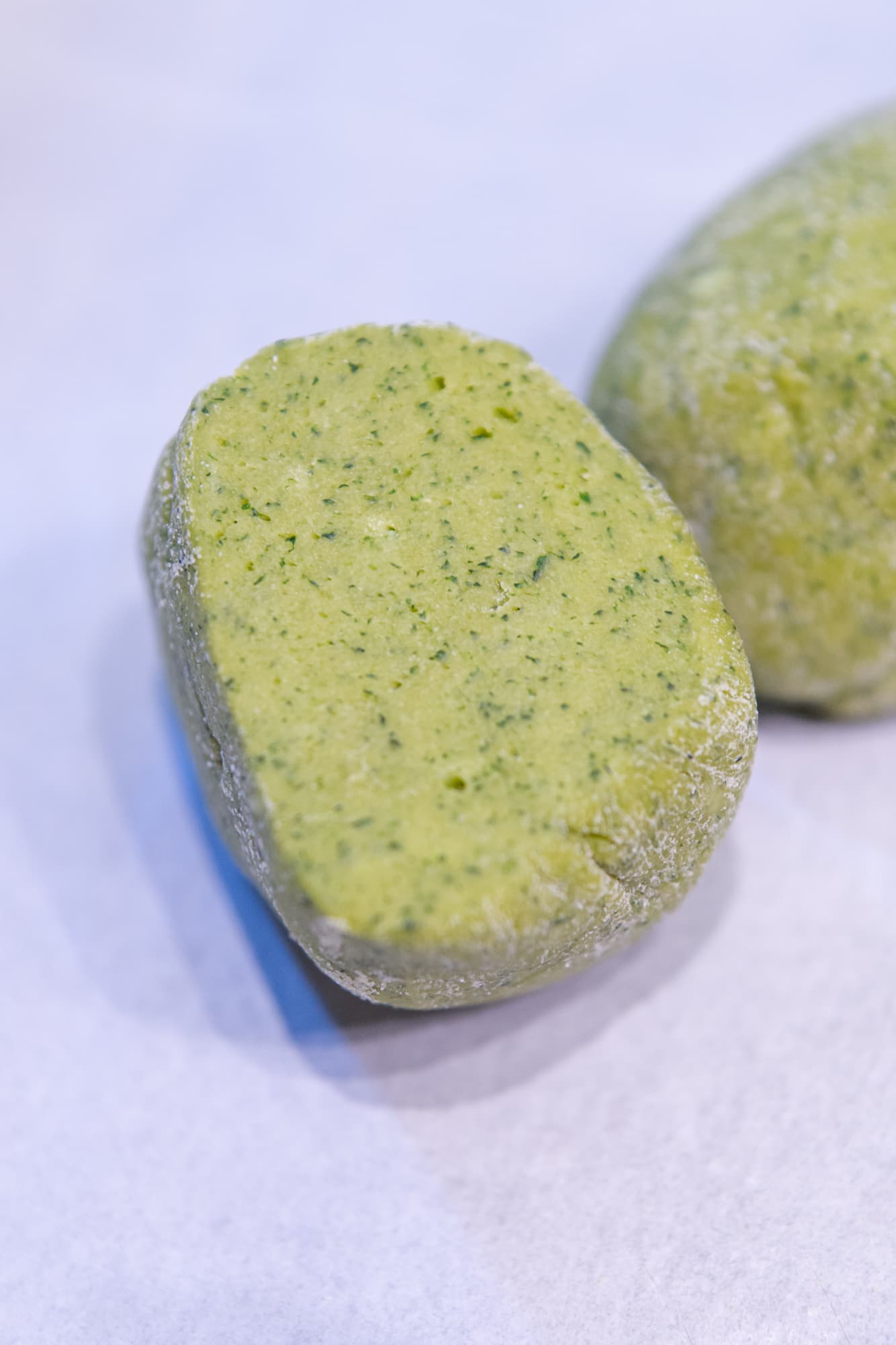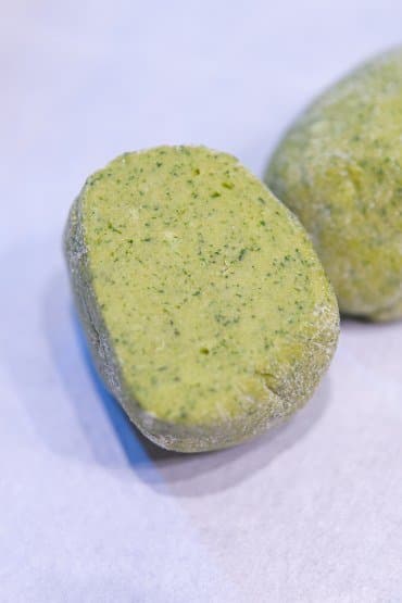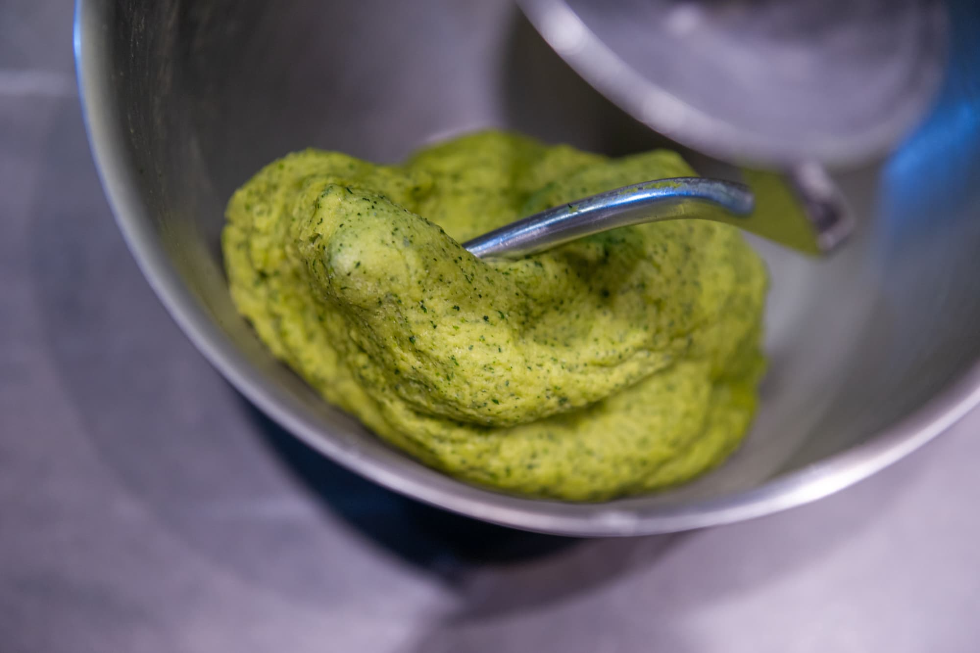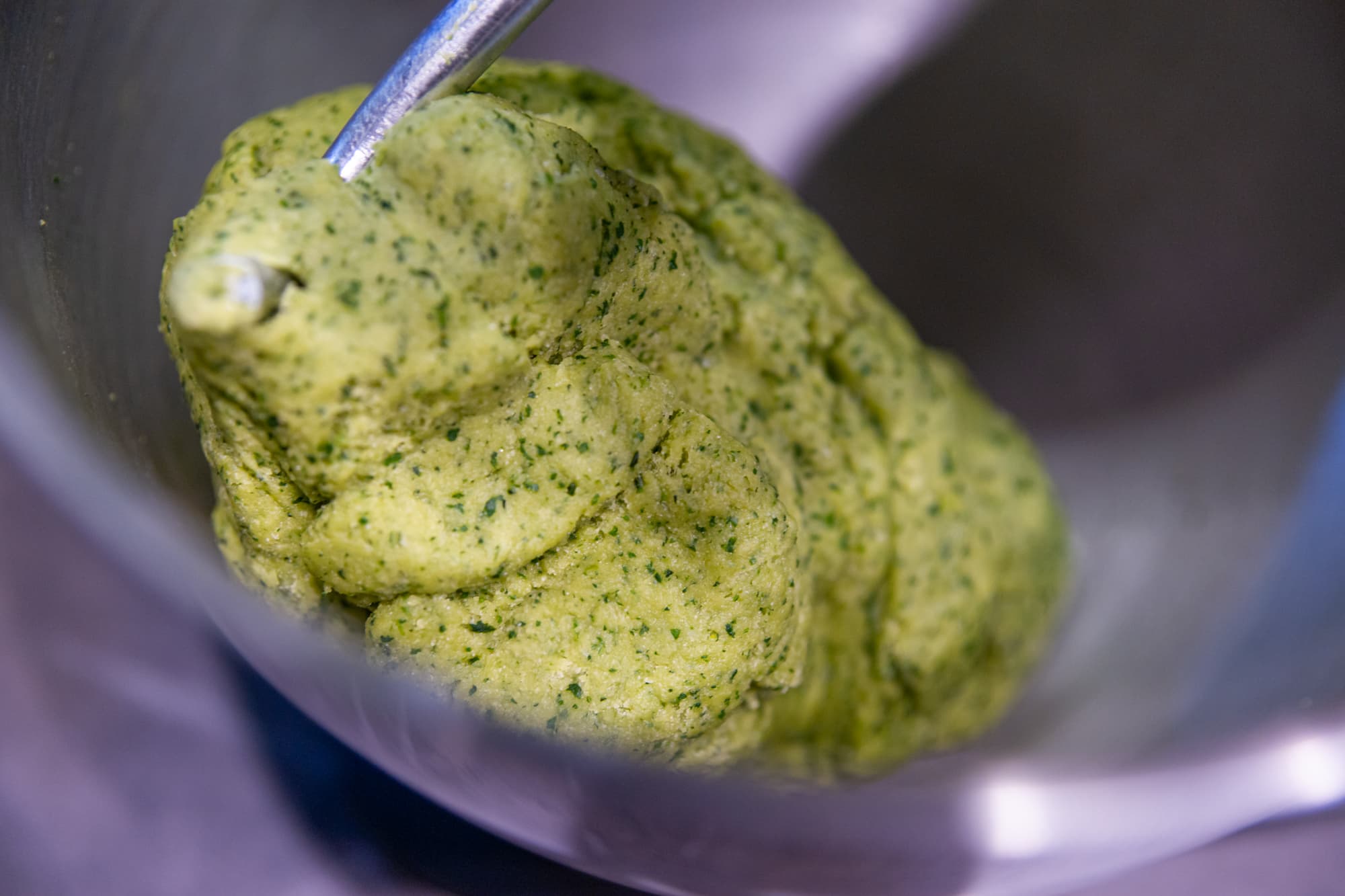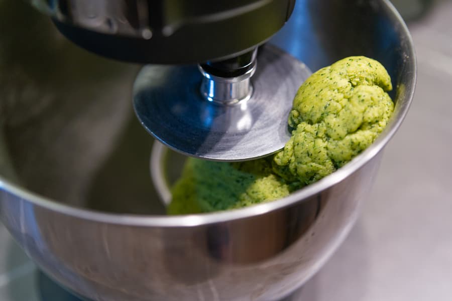 Гладкий тугой комок теста приятного зеленого цвета легко снялся с крюка и совсем не лип к рукам. Поместили его в полиэтиленовый пакет и оставили отдыхать. Вес колобка составил 970 г.