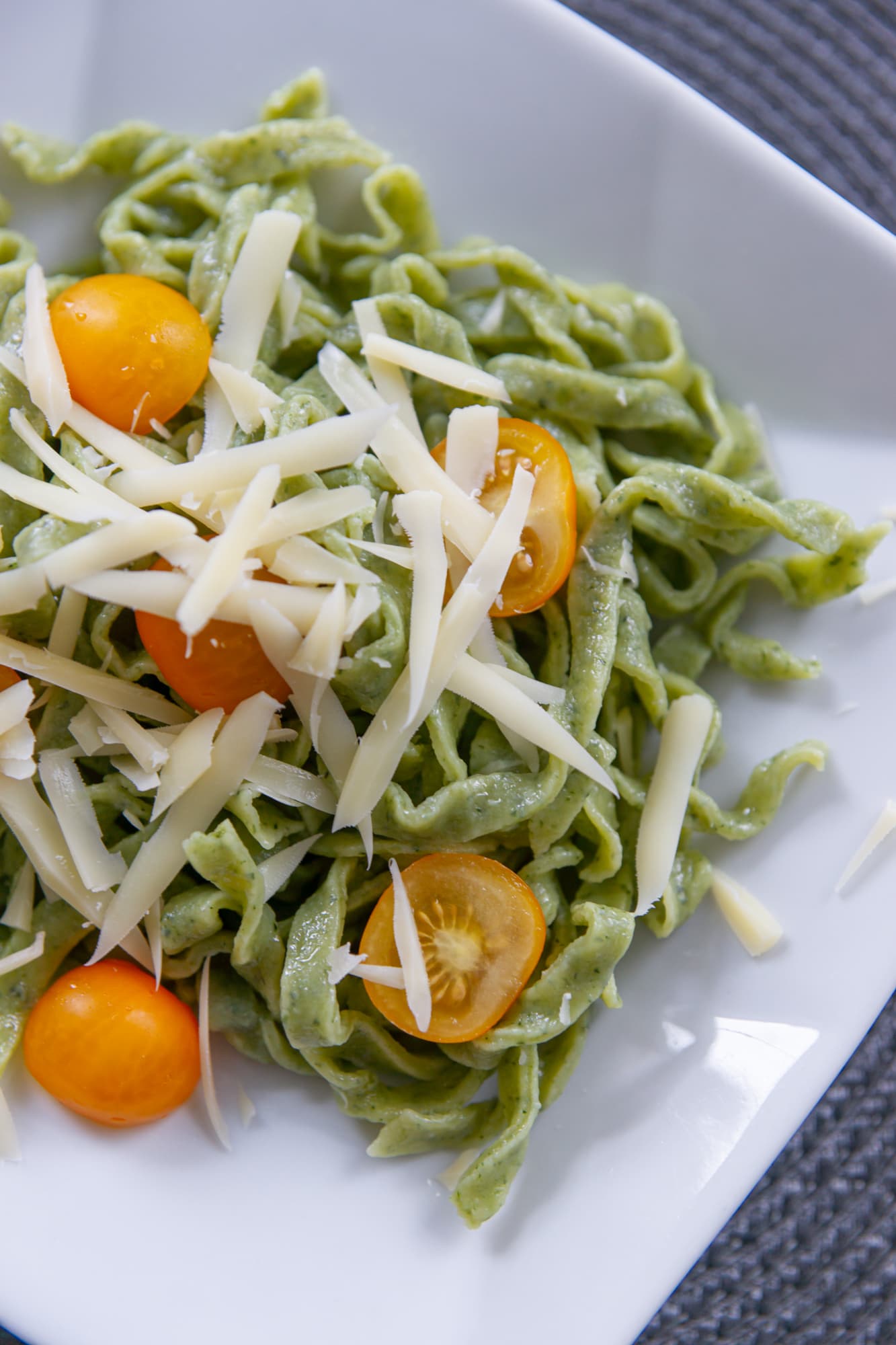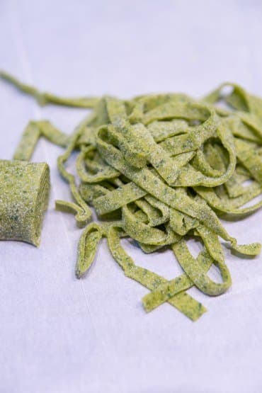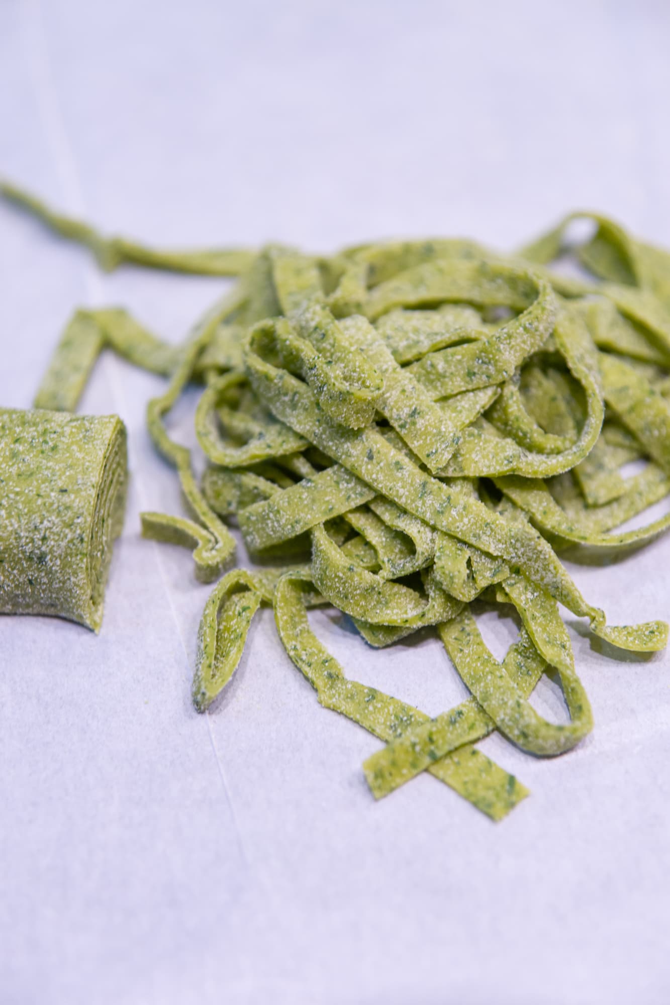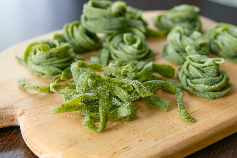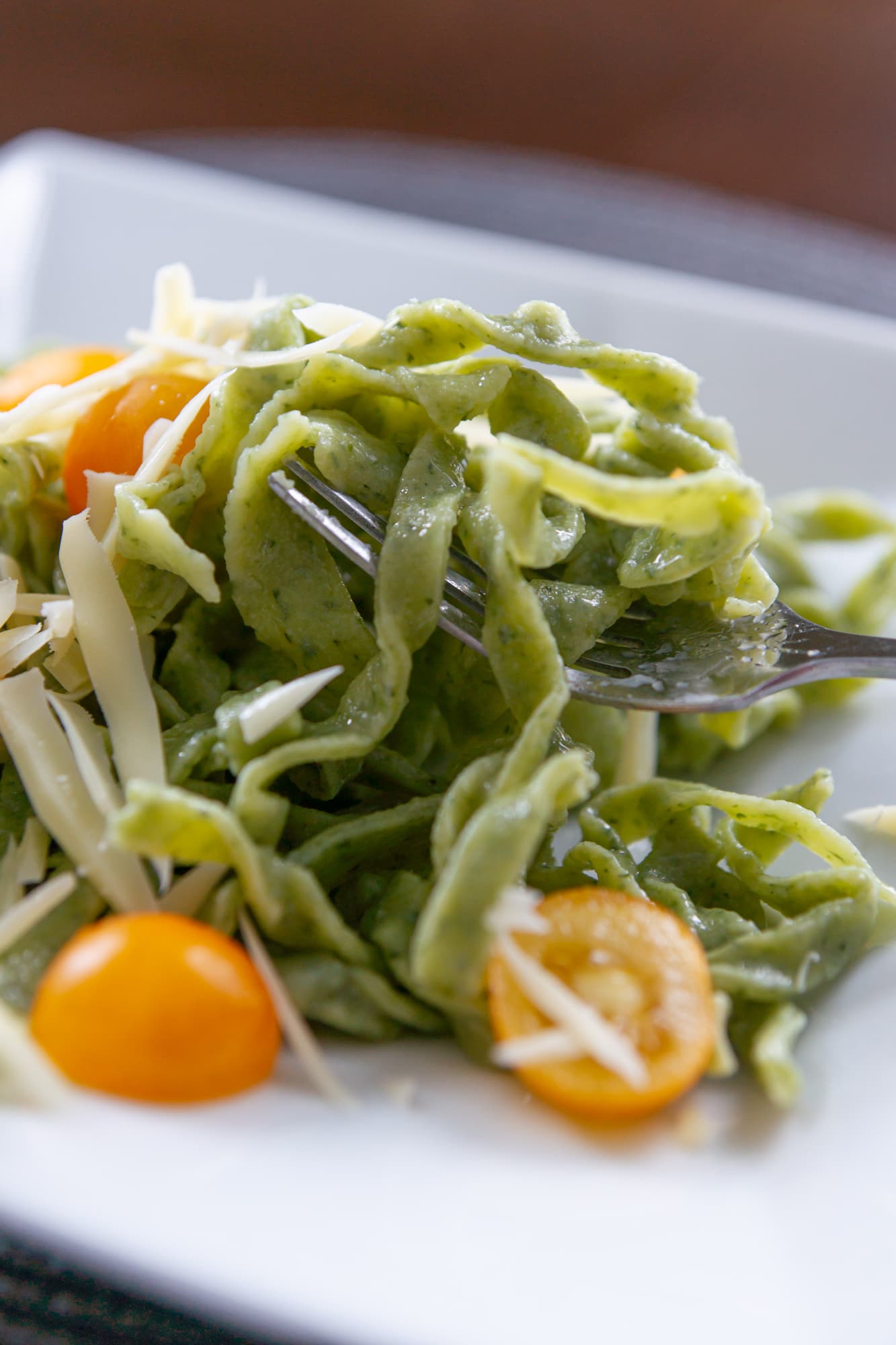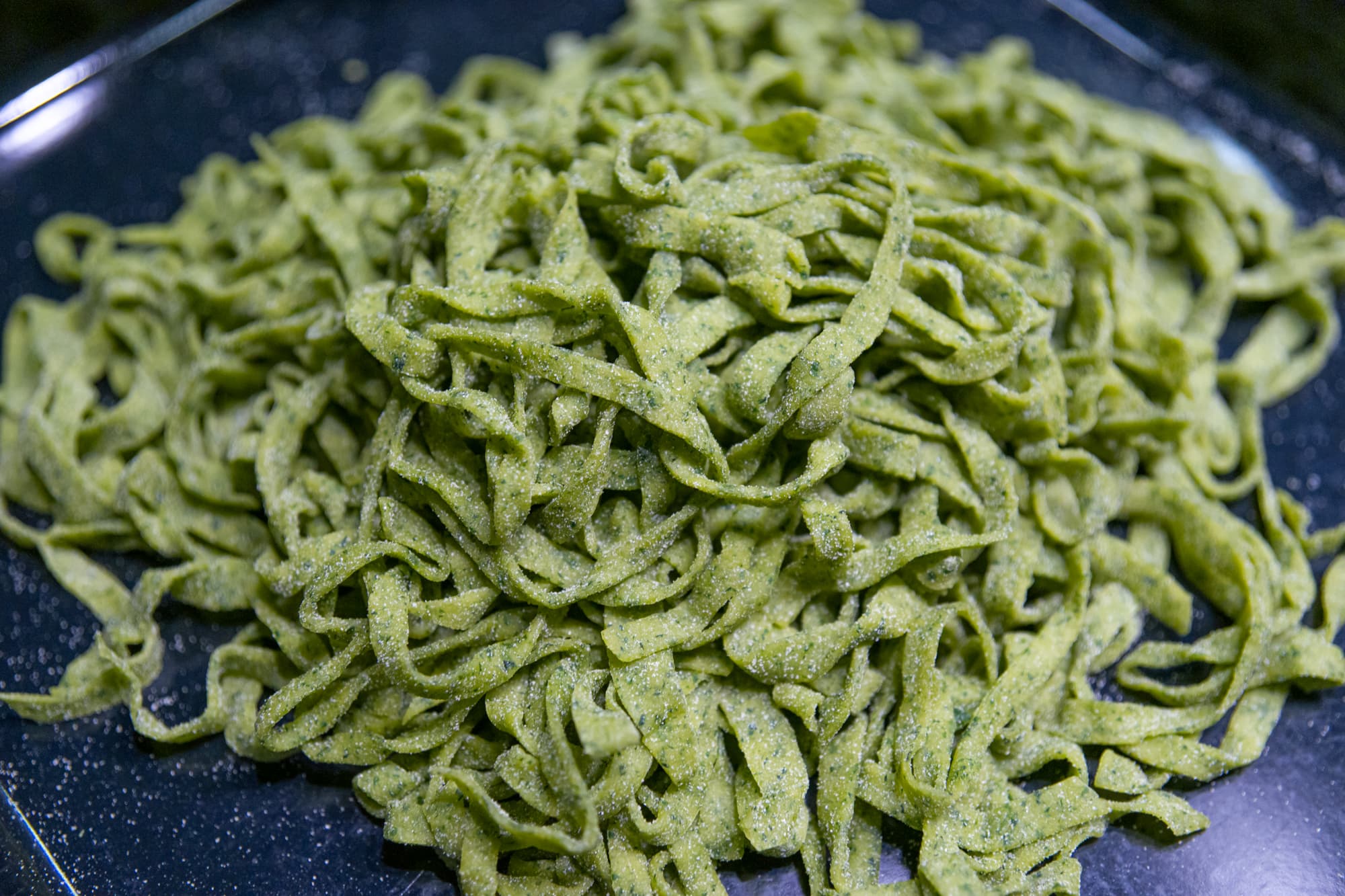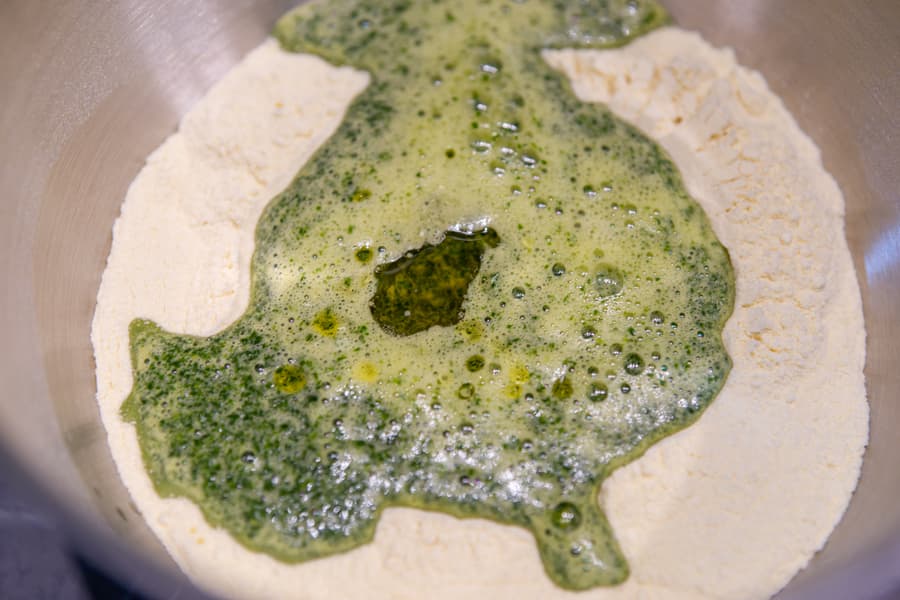 Сделали в муке углубление и добавили чайную ложку соли, две столовые ложки оливкового масла и четыре яйца, предварительно смешанных в блендере со шпинатом.