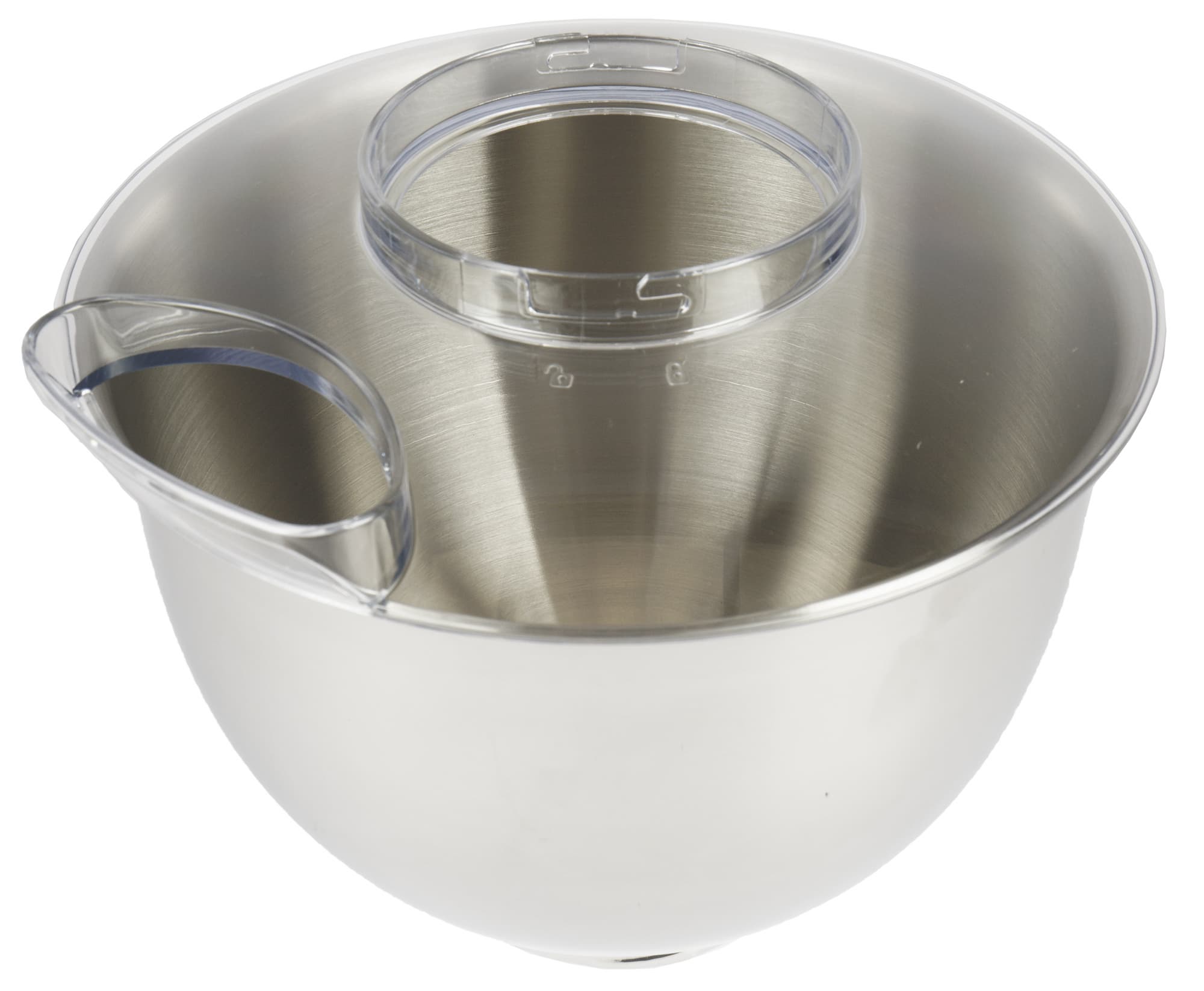 5-литровая чаша из нержавеющей стали внутри на дне имеет небольшой конусообразный выступ. Ручек и мерной шкалы у емкости нет. К чаше прилагается прозрачная пластиковая крышка с отверстием для подачи продуктов. Она крепится поворотом на выступе приводного вала.
