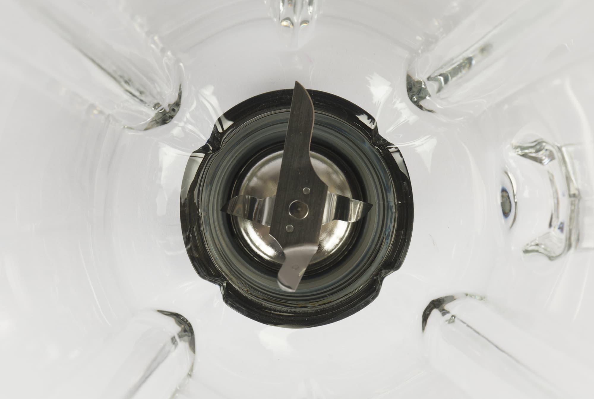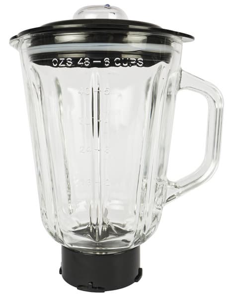 Кувшин блендера изготовлен из толстостенного прочного стекла. Объем кувшина составляет 1,5 литра. На стенках имеются риски: с одной стороны, миллилитры и литры, с другой — унции и чашки.