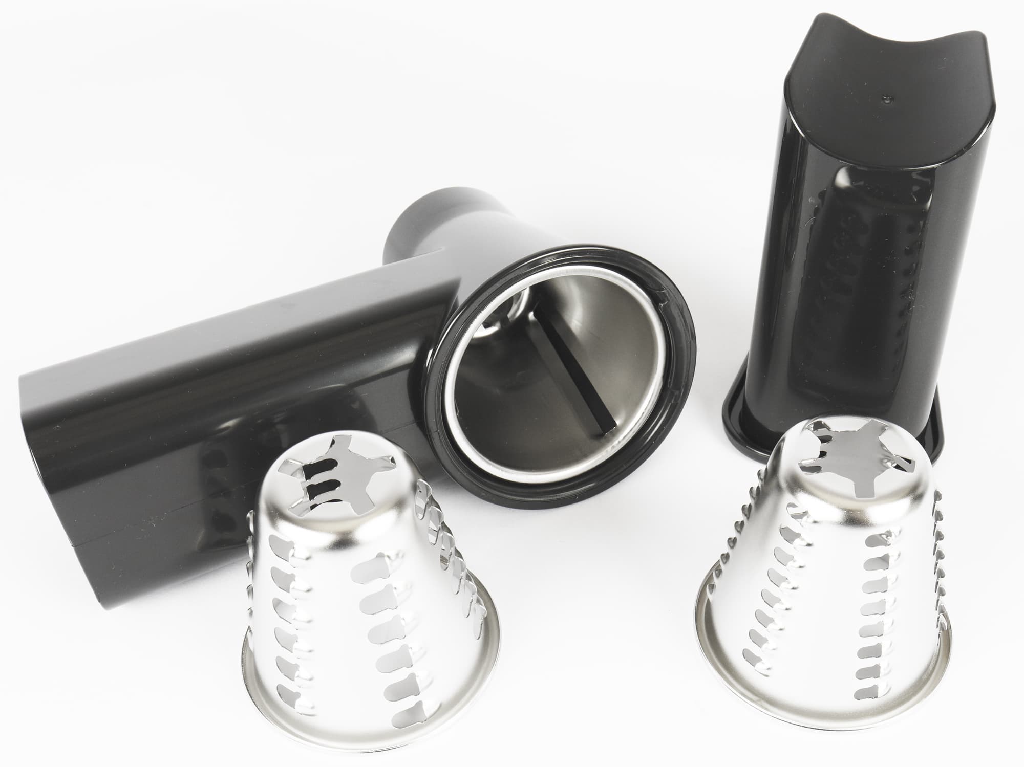 Овощерезка состоит из пластикового блока и трех металлических конусообразных терок. В комплекте: крупная терка, средняя и шинковка. Толкатель выполнен из черного крепкого пластика.