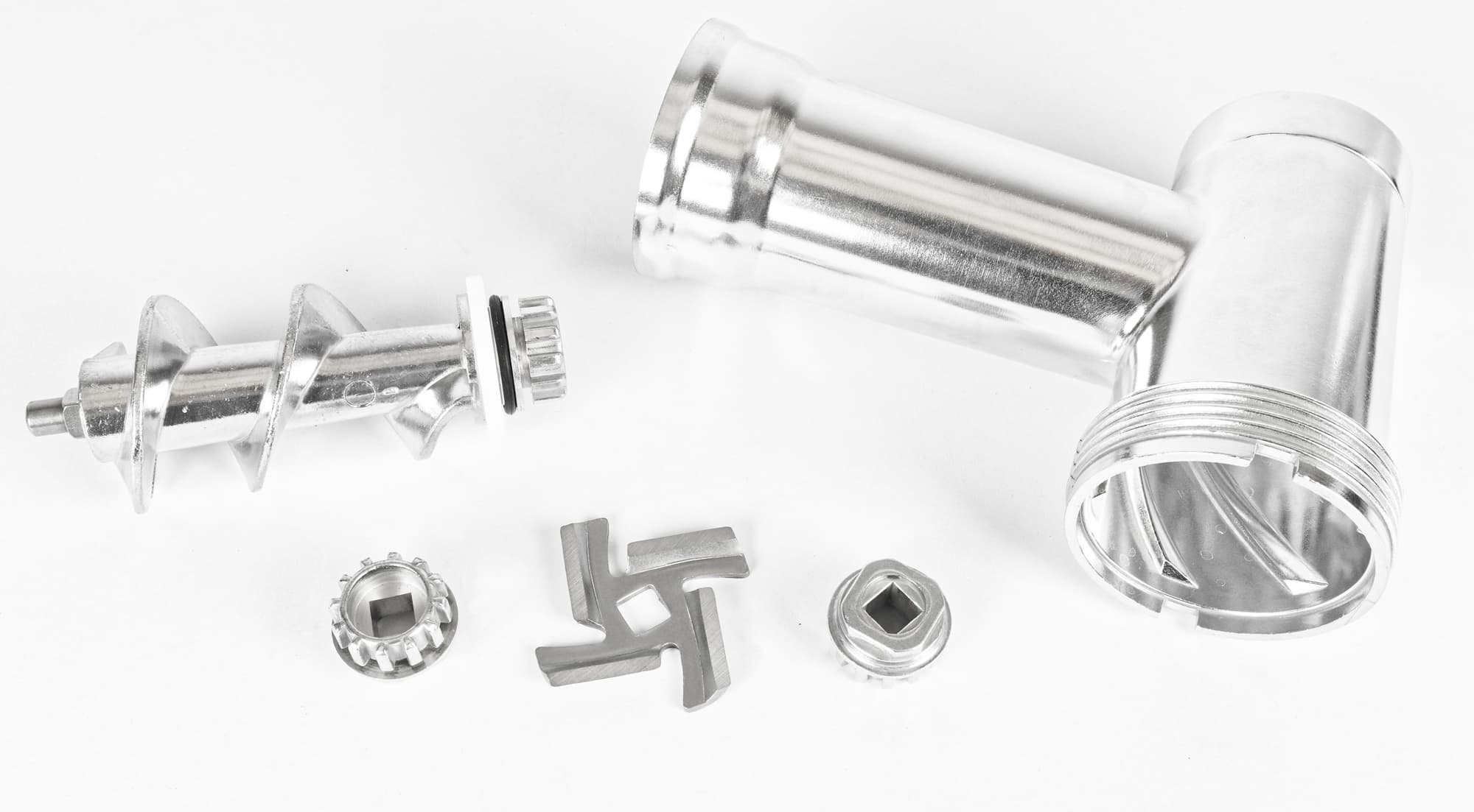 Корпус мясорубки выглядит классически: горловина, кольцевая гайка и шнек из алюминиевого сплава, нож и решетки из нержавеющей стали. Диаметр горловины — 5 см, высота — 12 см. Загрузочный лоток размером 21×14,5 см — металлический.