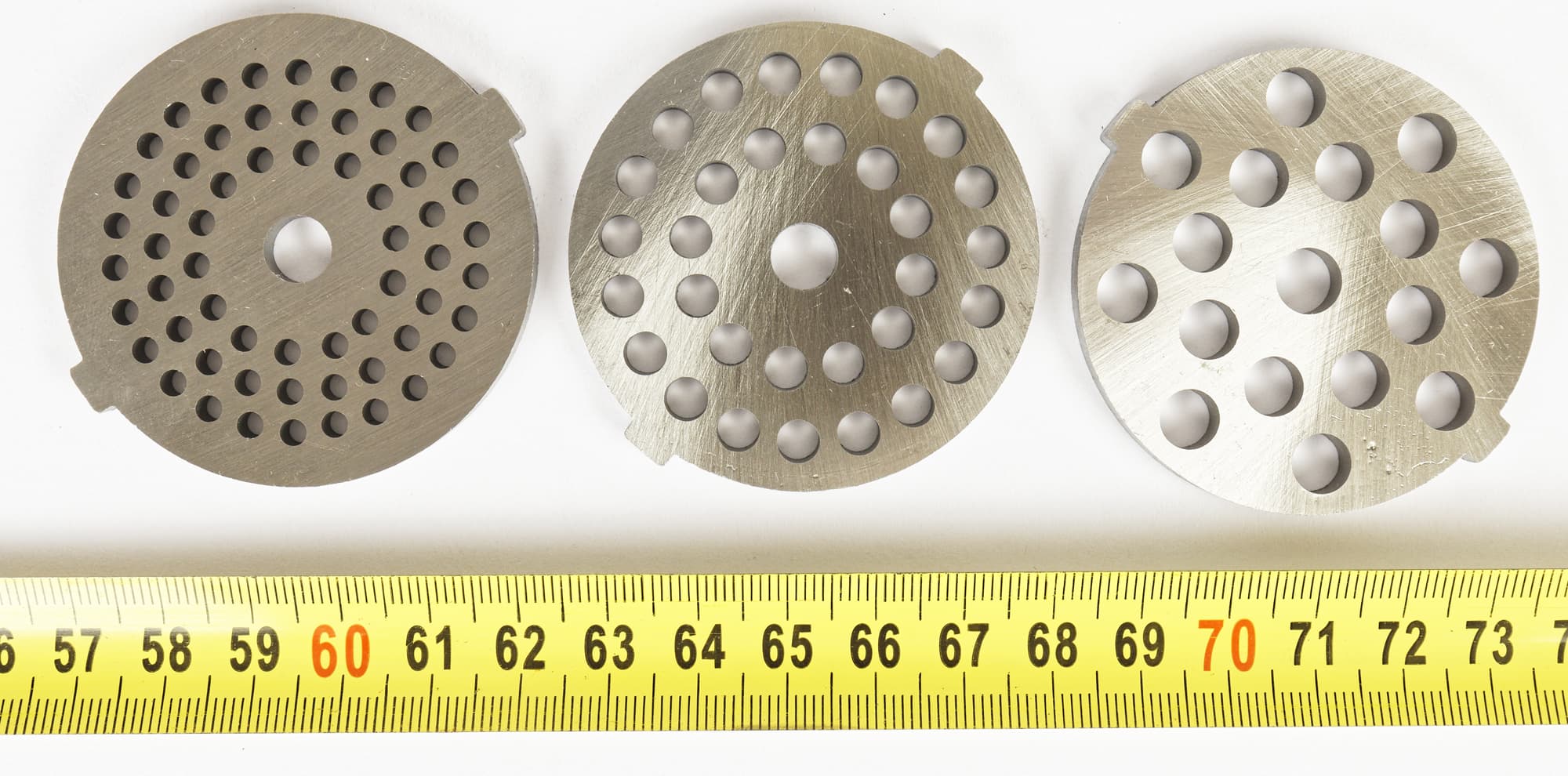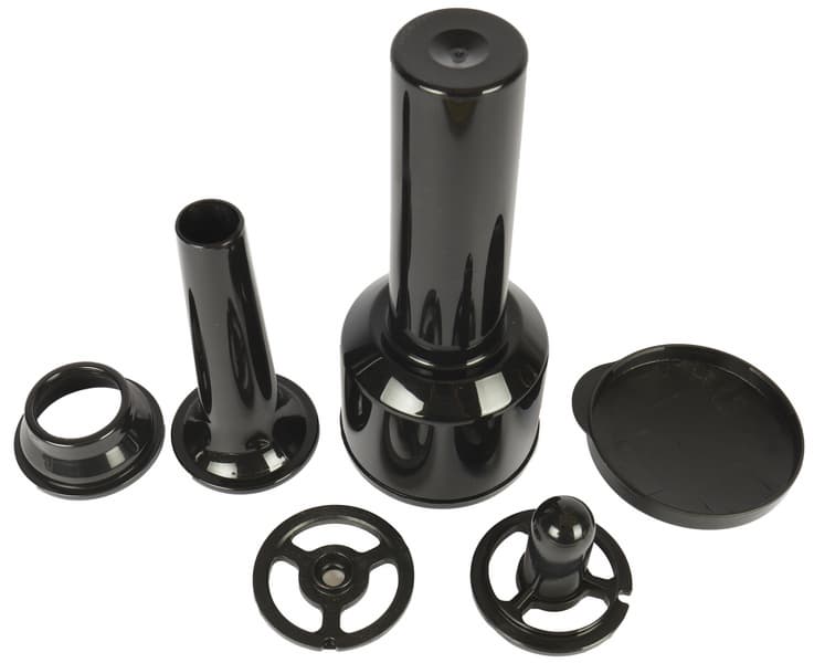 Толкатель, насадки для изготовления колбас и кеббе — пластиковые. Диаметр отверстия насадки на выходе — 1,7 см.